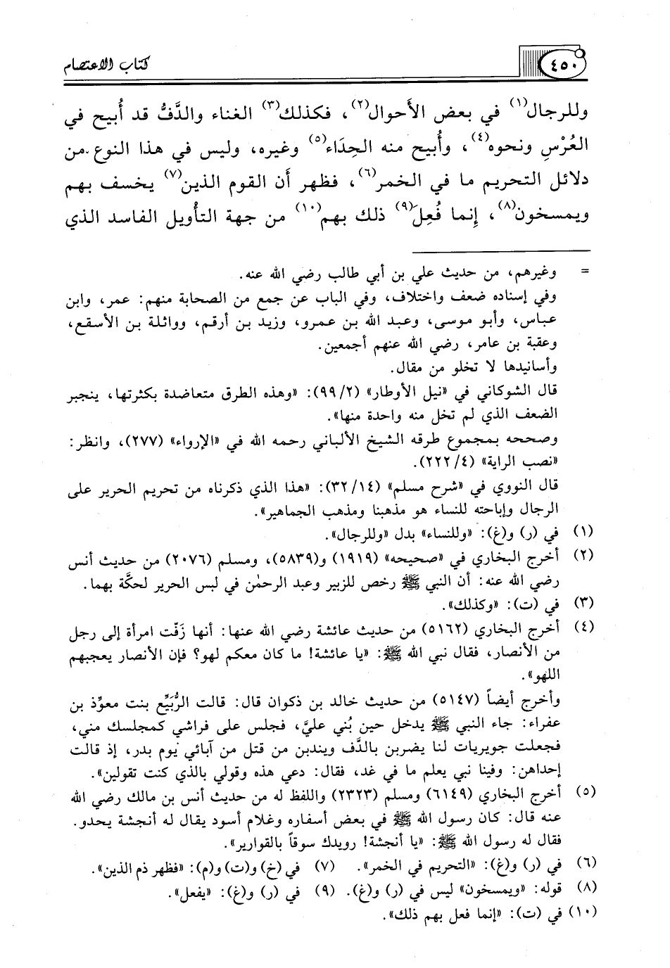 وَلِلرِّجَالِ (¬1) فِي بَعْضِ الأَحوال (¬2)، فَكَذَلِكَ (¬3) الْغِنَاءُ والدَّفُّ قَدْ أُبيح فِي العُرْسِ وَنَحْوِهِ (¬4)، وأُبيح مِنْهُ الحِدَاء (¬5) وَغَيْرُهُ، وَلَيْسَ فِي هَذَا النَّوْعِ مِنْ دلائل التحريم ما في الخمر (¬6)، فظهر أَن القوم الَّذِينَ (¬7) يُخْسَفُ بِهِمْ وَيُمْسَخُونَ (¬8)، إِنما فُعِلَ (¬9) ذَلِكَ بهم (¬10) من جهة التأْويل الفاسد الذي