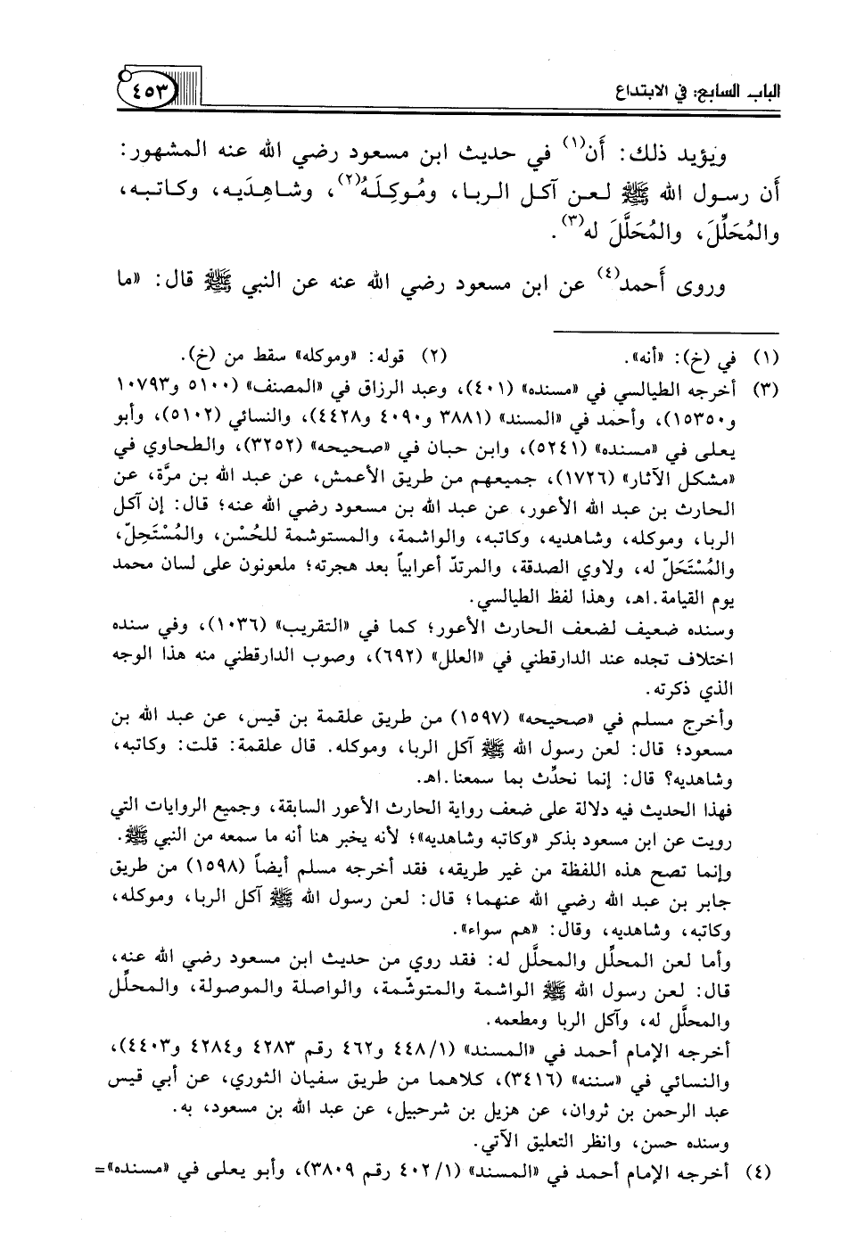 (¬3) أخرجه الطيالسي في "مسنده" (401)، وعبد الرزاق في "المصنف" (5100 و10793 و15350)، وأحمد في "المسند" (3881 و4090 و4428)، والنسائي (5102)، وأبو يعلى في "مسنده" (5241)، وابن حبان في "صحيحه" (3252)، والطحاوي في "مشكل الآثار" (1726)، جميعهم من طريق الأعمش، عن عبد الله بن مرَّة، عن الحارث بن عبد الله الأعور، عن عبد الله بن مسعود رضي الله عنه؛ قال: إن آكل الربا، وموكله، وشاهديه، وكاتبه، والواشمة، والمستوشمة للحُسْن، والمُسْتَحِلّ، والمُسْتَحَلّ له، ولاوي الصدقة، والمرتدّ أعرابياً بعد هجرته؛ ملعونون على لسان محمد يوم القيامة. اهـ، وهذا لفظ الطيالسي.