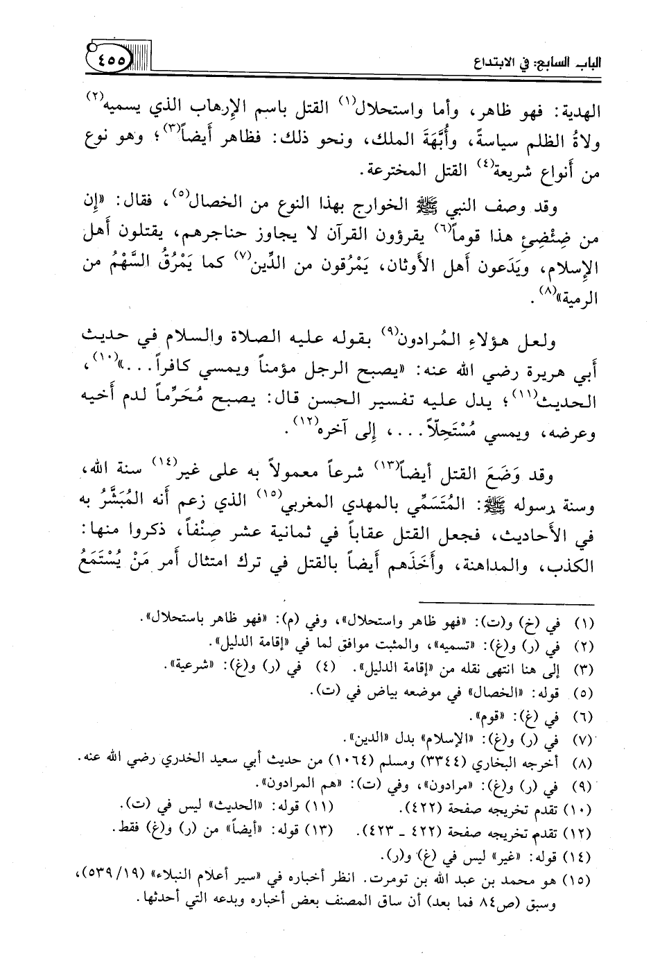 وقد وَضَعَ القتل أيضاً (¬13) شَرْعًا مَعْمُولًا بِهِ عَلَى غَيْرِ (¬14) سُنَّةِ اللَّهِ، وسنة رسوله صلّى الله عليه وسلّم: المُتَسَمِّي بِالْمَهْدِيِّ الْمَغْرِبِيِّ (¬15) الَّذِي زَعَمَ أَنه المُبَشَّرُ بِهِ فِي الأَحاديث، فَجَعَلَ الْقَتْلَ عِقَابًا فِي ثَمَانِيَةَ عَشَرَ صِنْفاً، ذَكَرُوا مِنْهَا: الْكَذِبَ، وَالْمُدَاهَنَةَ، وأَخَذَهم أَيضاً بِالْقَتْلِ فِي تَرْكِ امْتِثَالِ أَمر مَنْ يُسْتَمَعُ