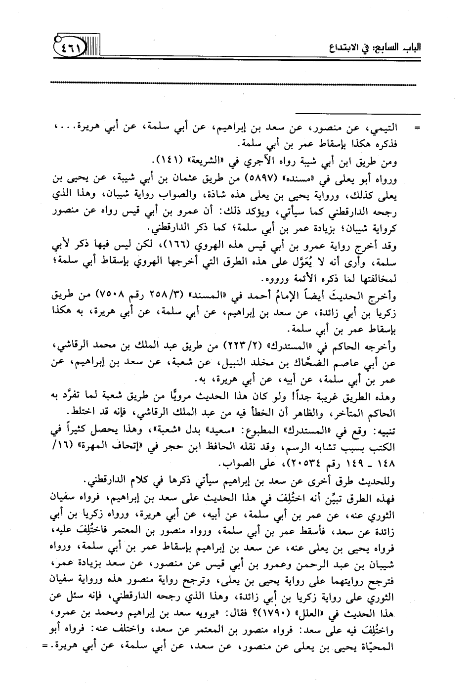 فهذه الطرق تبيِّن أنه اختُلِفَ في هذا الحديث على سعد بن إبراهيم، فرواه سفيان الثوري عنه، عن عمر بن أبي سلمة، عن أبيه، عن أبي هريرة، ورواه زكريا بن أبي زائدة عن سعد، فأسقط عمر بن أبي سلمة، ورواه منصور بن المعتمر فاختُلِفَ عليه، فرواه يحيى بن يعلى عنه، عن سعد بن إبراهيم بإسقاط عمر بن أبي سلمة، ورواه شيبان بن عبد الرحمن وعمرو بن أبي قيس عن منصور، عن سعد بزيادة عمر، فترجح روايتهما على رواية يحيى بن يعلى، وترجح رواية منصور هذه ورواية سفيان الثوري على رواية زكريا بن أبي زائدة، وهذا الذي رجحه الدارقطني، فإنه سئل عن هذا الحديث في "العلل" (1790)؟ فقال: "يرويه سعد بن إبراهيم ومحمد بن عمرو، واختُلِفَ فيه على سعد: فرواه منصور بن المعتمر عن سعد، واختلف عنه: فرواه أبو المحيّاة يحيى بن يعلى عن منصور، عن سعد، عن أبي سلمة، عن أبي هريرة.=