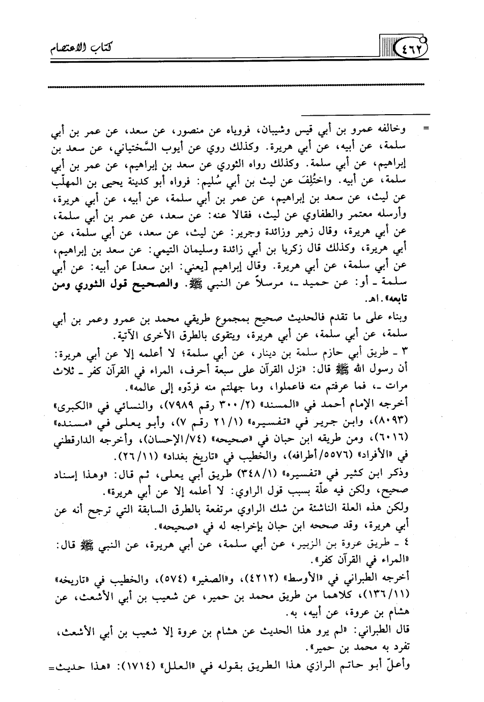 4 ـ طريق عروة بن الزبير، عن أبي سلمة، عن أبي هريرة، عن النبي صلّى الله عليه وسلّم قال: "المراء في القرآن كفر".