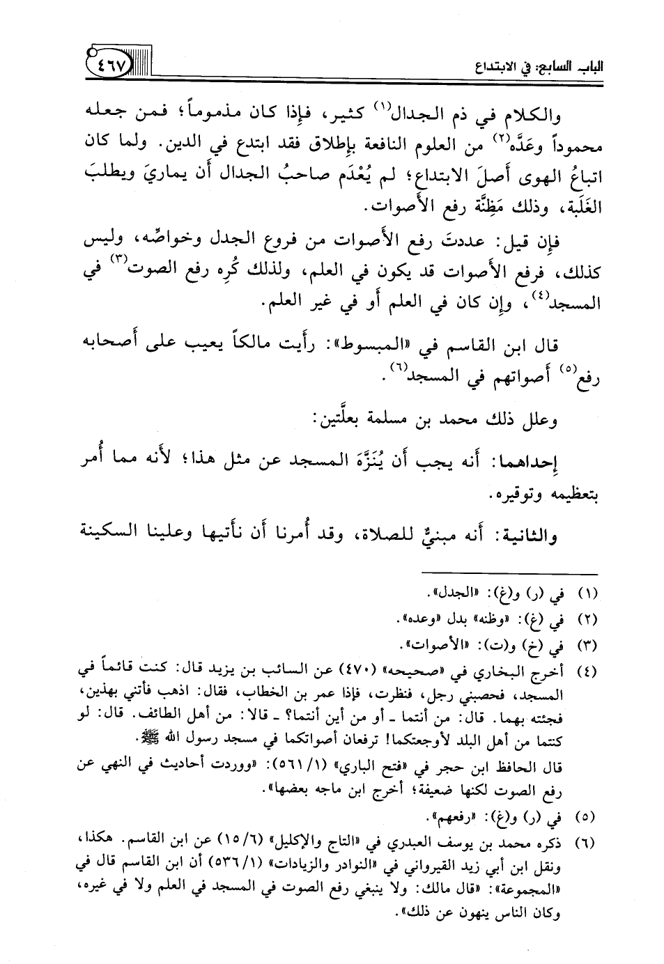 (¬6) ذكره محمد بن يوسف العبدري في "التاج والإكليل" (6/ 15) عن ابن القاسم. هكذا، ونقل ابن أبي زيد القيرواني في "النوادر والزيادات" (1/ 536) أن ابن القاسم قال في "المجموعة": "قال مالك: ولا ينبغي رفع الصوت في المسجد في العلم ولا في غيره، وكان الناس ينهون عن ذلك".