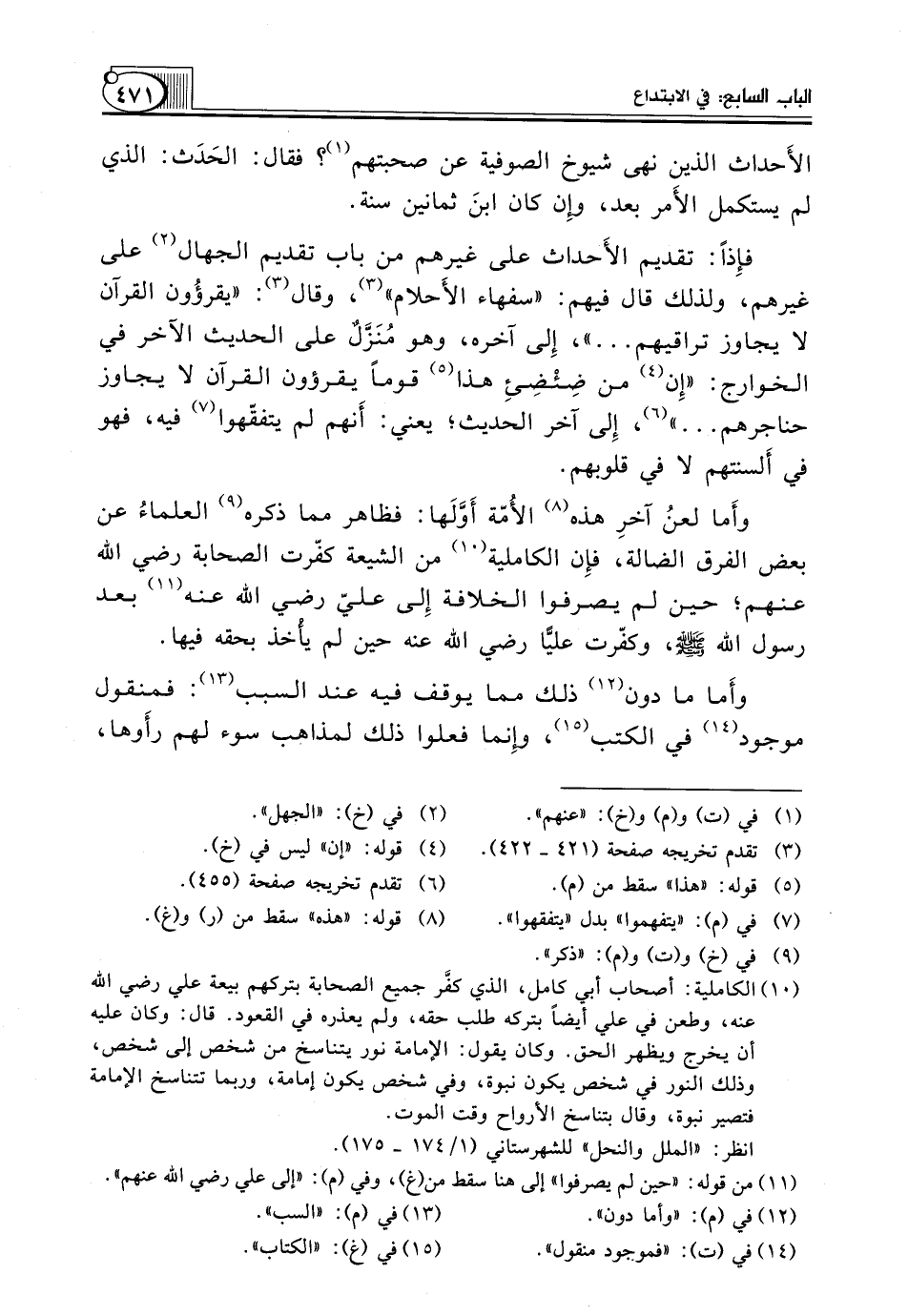 (¬10) الكاملية: أصحاب أبي كامل، الذي كفَّر جميع الصحابة بتركهم بيعة علي رضي الله عنه، وطعن في علي أيضاً بتركه طلب حقه، ولم يعذره في القعود. قال: وكان عليه أن يخرج ويظهر الحق. وكان يقول: الإمامة نور يتناسخ من شخص إلى شخص، وذلك النور في شخص يكون نبوة، وفي شخص يكون إمامة، وربما تتناسخ الإمامة فتصير نبوة، وقال بتناسخ الأرواح وقت الموت.
