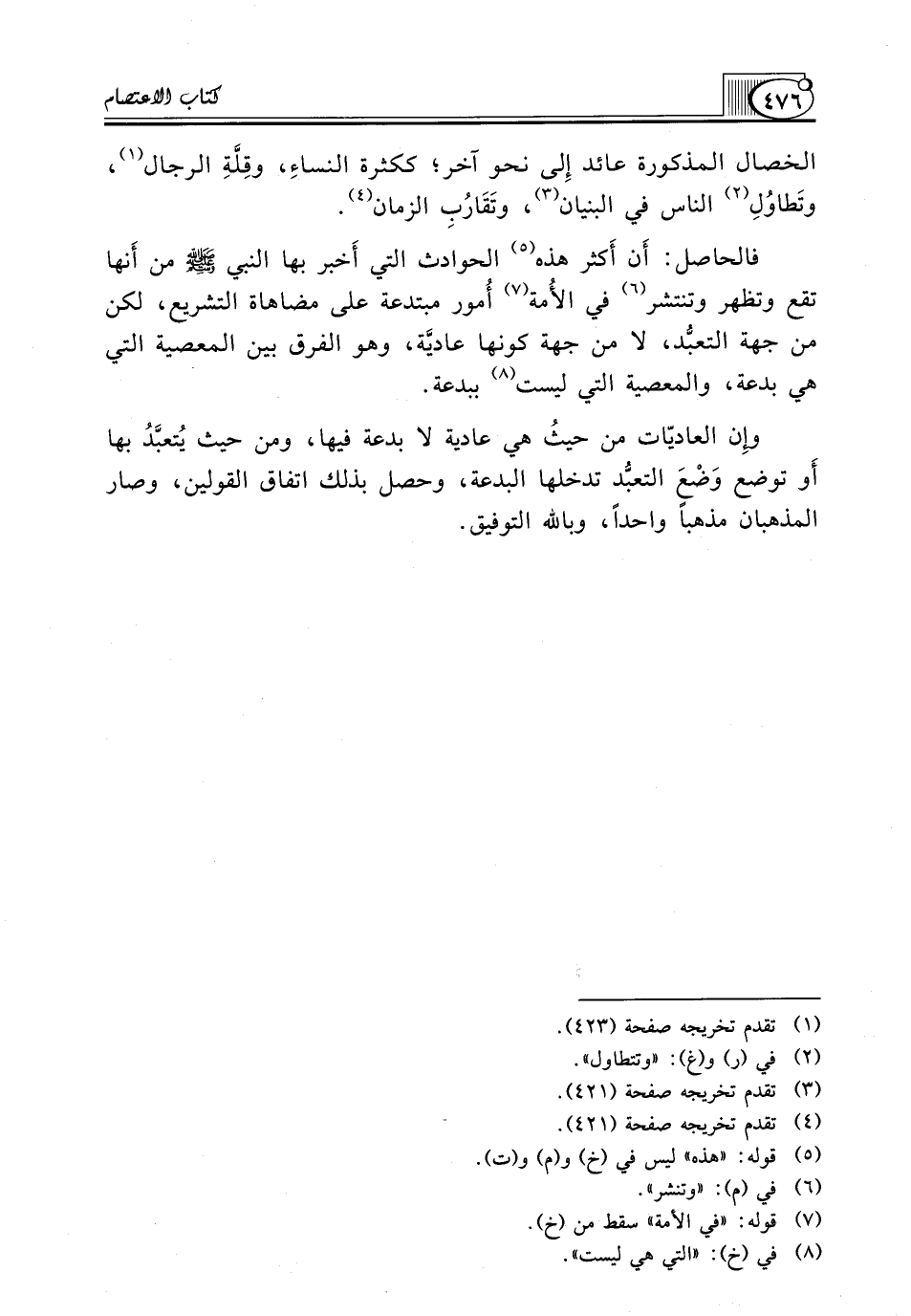 فالحاصل: أَن أَكثر هذه (¬5) الْحَوَادِثِ الَّتِي أَخبر بِهَا النَّبِيُّ صَلَّى اللَّهُ عَلَيْهِ وَسَلَّمَ مِنْ أَنها تَقَعُ وَتَظْهَرُ وَتَنْتَشِرُ (¬6) في الأُمة (¬7) أُمور مُبْتَدَعَةٌ عَلَى مُضَاهَاةِ التَّشْرِيعِ، لَكِنْ مِنْ جِهَةِ التعبُّد، لَا مِنْ جِهَةِ كَوْنِهَا عاديَّة، وَهُوَ الْفَرْقُ بَيْنَ الْمَعْصِيَةِ الَّتِي هِيَ بِدْعَةٌ، والمعصية التي لَيْسَتْ (¬8) بِبِدْعَةٍ.