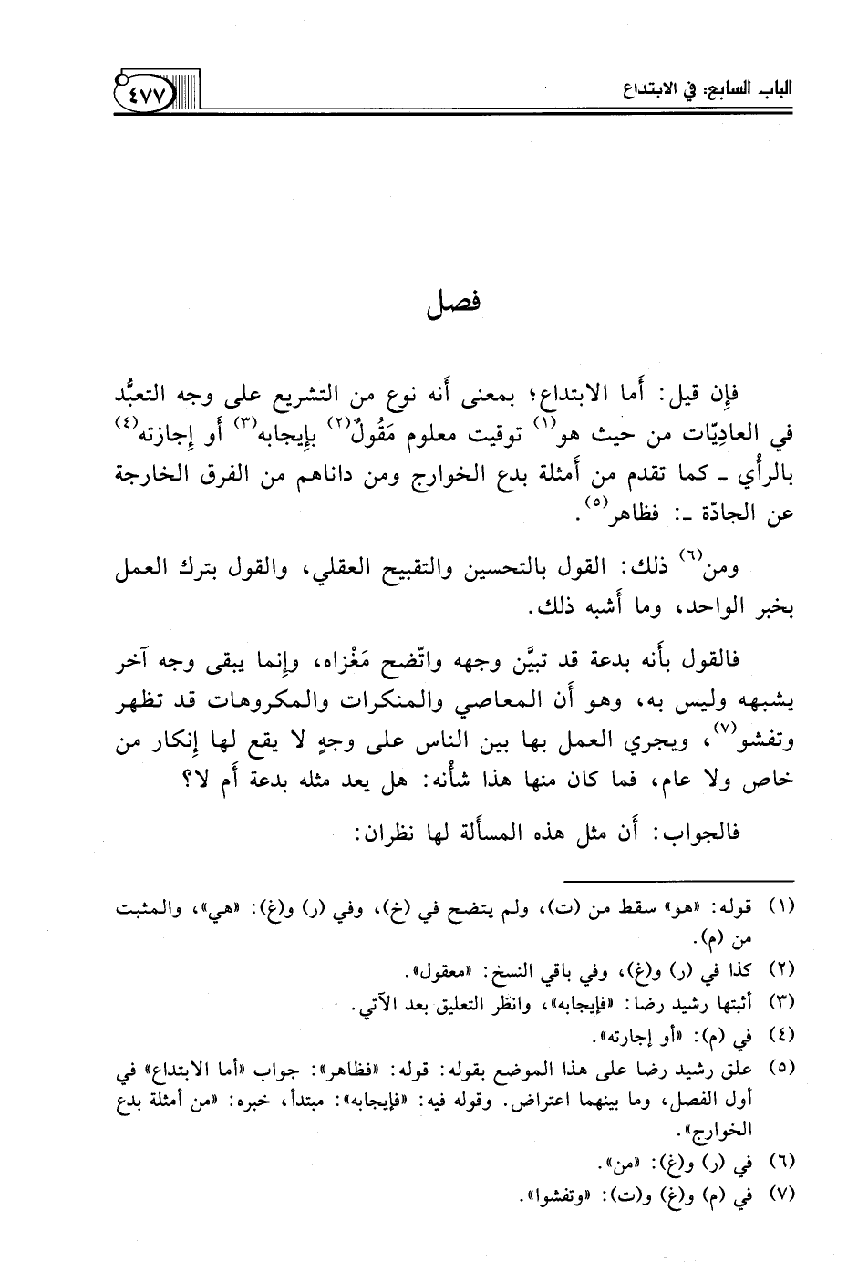 (¬5) علق رشيد رضا على هذا الموضع بقوله: قوله: "فظاهر": جواب "أما الابتداع" في أول الفصل، وما بينهما اعتراض. وقوله فيه: "فإيجابه": مبتدأ، خبره: "من أمثلة بدع الخوارج".