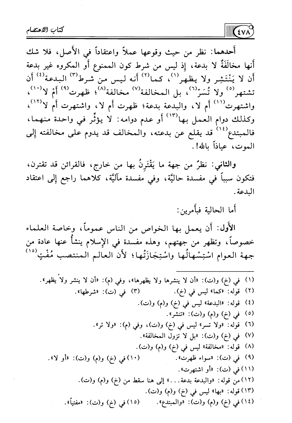 الأَول: أَن يَعْمَلَ بِهَا الْخَوَاصُّ مِنَ النَّاسِ عُمُومًا، وَخَاصَّةً الْعُلَمَاءَ خُصُوصًا، وَتَظْهَرُ مِنْ جِهَتِهِمْ، وَهَذِهِ مَفْسَدَةٌ فِي الإِسلام ينشأُ عَنْهَا عَادَةً مِنْ جِهَةِ الْعَوَامِّ اسْتِسْهالُها واسْتِجَازَتُها؛ لأَن العالم المنتصب مُفْتٍ (¬15)