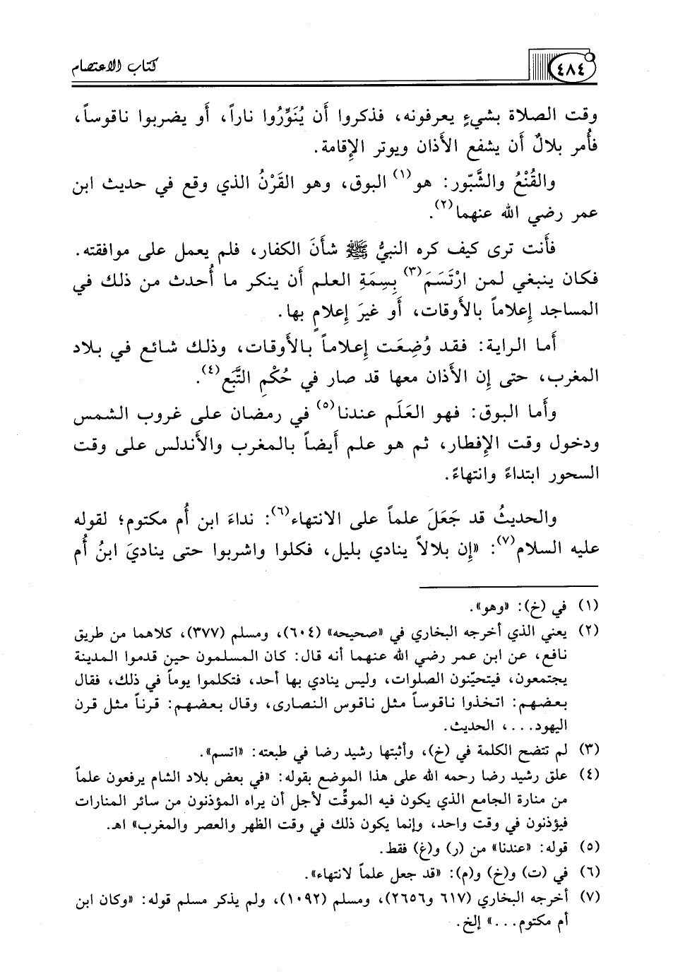 (¬4) علق رشيد رضا رحمه الله على هذا الموضع بقوله: "في بعض بلاد الشام يرفعون علماً من منارة الجامع الذي يكون فيه الموقِّت لأجل أن يراه المؤذنون من سائر المنارات فيؤذنون في وقت واحد، وإنما يكون ذلك في وقت الظهر والعصر والمغرب" اهـ.