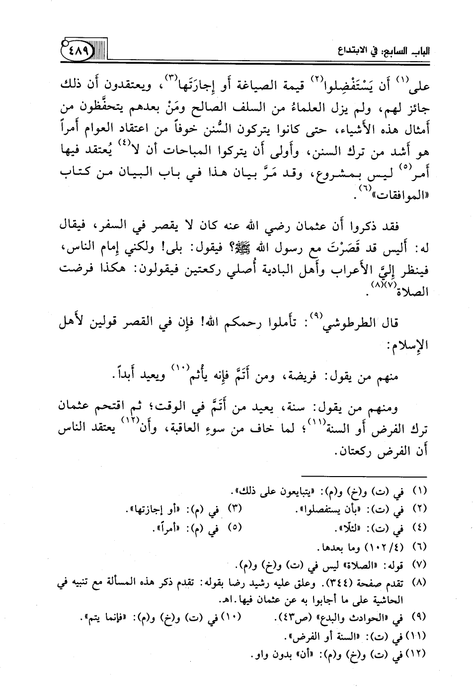 على (¬1) أَن يَسْتَفْضِلوا (¬2) قِيمَةَ الصِّيَاغَةِ أَو إِجارَتَها (¬3)، وَيَعْتَقِدُونَ أَن ذَلِكَ جَائِزٌ لَهُمْ، وَلَمْ يَزَلِ العلماءُ مِنَ السَّلَفِ الصَّالِحِ ومَنْ بَعْدَهُمْ يتحفَّظون مِنْ أَمثال هَذِهِ الأَشياء، حَتَّى كَانُوا يَتْرُكُونَ السُّنن خَوْفًا مِنِ اعْتِقَادِ الْعَوَامِّ أَمراً هُوَ أَشد مِنْ تَرْكِ السُّنَنِ، وأَولى أَن يَتْرُكُوا الْمُبَاحَاتِ أَنْ لَا (¬4) يُعتقد فِيهَا أَمر (¬5) لَيْسَ بِمَشْرُوعٍ، وَقَدْ مَرَّ بَيَانُ هَذَا فِي بَابِ الْبَيَانِ مِنْ كِتَابِ "الْمُوَافَقَاتِ" (¬6) ..