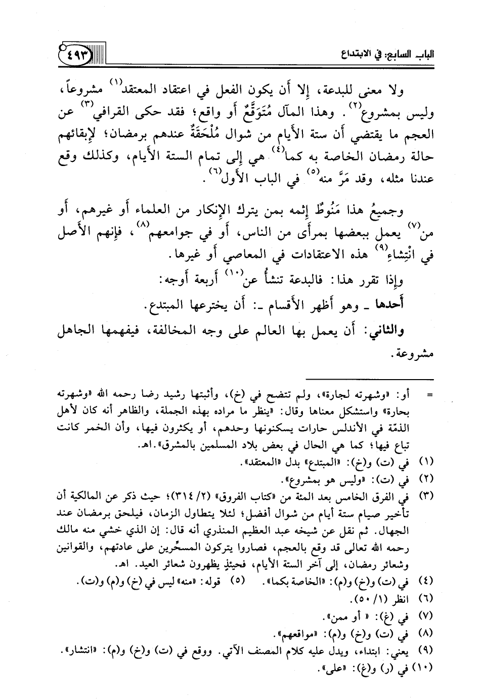 (¬3) في الفرق الخامس بعد المئة من "كتاب الفروق" (2/ 314)؛ حيث ذكر عن المالكية أن تأخير صيام ستة أيام من شوال أفضل؛ لئلا يتطاول الزمان، فيلحق برمضان عند الجهال. ثم نقل عن شيخه عبد العظيم المنذري أنه قال: إن الذي خشي منه مالك رحمه الله تعالى قَدْ وَقَعَ بِالْعَجَمِ، فَصَارُوا يَتْرُكُونَ المسحِّرين عَلَى عادتهم، والقوانين وشعائر رمضان، إلى آخر الستة الأيام، فحيئذٍ يظهرون شعائر العيد. اهـ.