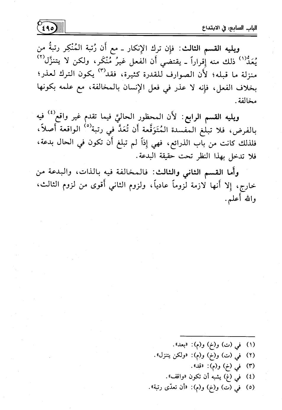 وأَما الْقِسْمُ الثَّانِي وَالثَّالِثُ: فَالْمُخَالَفَةُ فِيهِ بِالذَّاتِ، وَالْبِدْعَةُ مِنْ خَارِجٍ، إِلا أَنها لَازِمَةٌ لُزُومًا عَادِيًّا، وَلُزُومُ الثَّانِي أَقوى من لزوم الثالث، والله أَعلم.