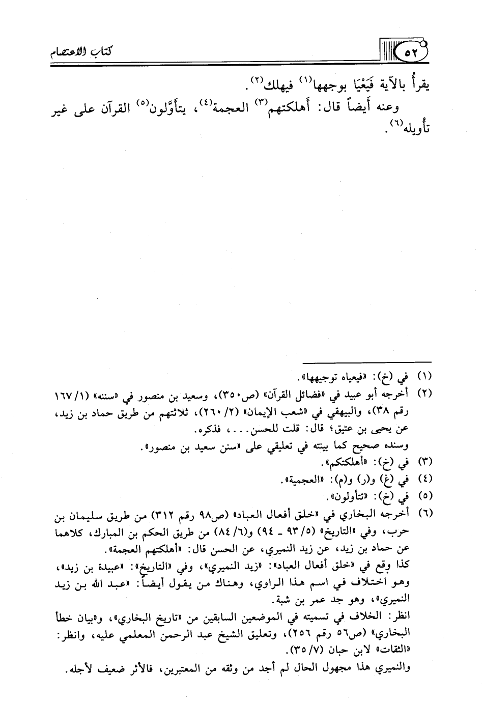 (¬6) أخرجه البخاري في "خلق أفعال العباد" (ص98 رقم 312) من طريق سليمان بن حرب، وفي "التاريخ" (5/ 93 ـ 94) و (6/ 84) من طريق الحكم بن المبارك، كلاهما عن حماد بن زيد، عن زيد النميري، عن الحسن قال: "أهلكتهم العجمة".