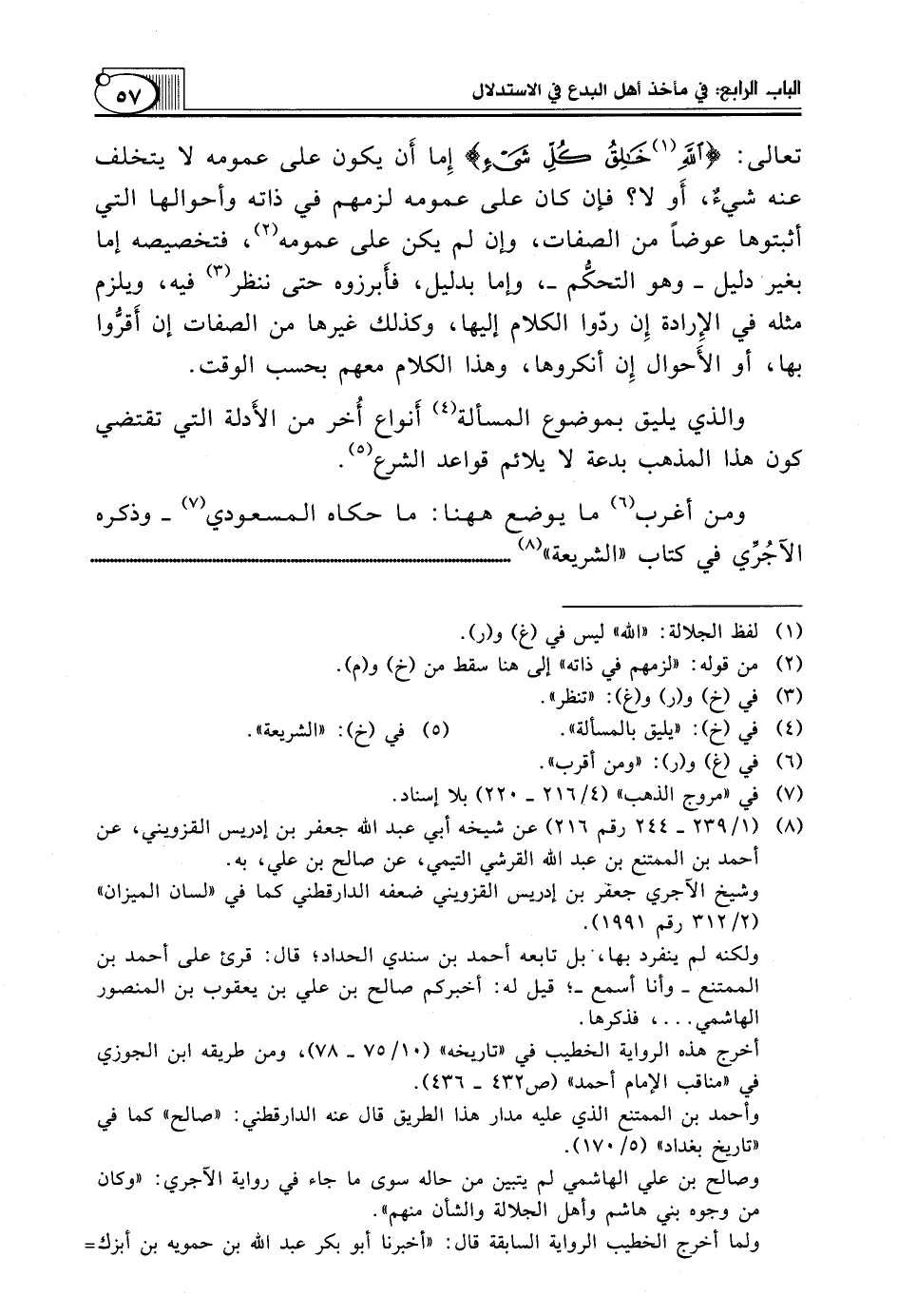 تعالى: {اللَّهِ (¬1) خَالِقُ كُلِّ شَيْءٍ} إِما أَن يَكُونَ عَلَى عُمُومِهِ لَا يَتَخَلَّفُ عَنْهُ شيءٌ، أَو لَا؟ فَإِنْ كَانَ عَلَى عمومه لزمهم في ذاته وأحوالها التي أثبتوها عوضاً من الصفات، وإن لم يكن عَلَى عُمُومِهِ (¬2)، فَتَخْصِيصُهُ إِمَّا بِغَيْرِ دَلِيلٍ ـ وَهُوَ التحكُّم ـ، وَإِمَّا بِدَلِيلٍ، فأَبرزوه حَتَّى نَنْظُرَ (¬3) فِيهِ، وَيَلْزَمُ مِثْلُهُ فِي الإِرادة إِن رَدُّوا الْكَلَامَ إِلَيْهَا، وَكَذَلِكَ غَيْرُهَا مِنَ الصِّفَاتِ إِنْ أَقرُّوا بِهَا، أَوِ الأَحوال إِن أَنْكَرُوهَا، وَهَذَا الْكَلَامُ معهم بحسب الوقت.