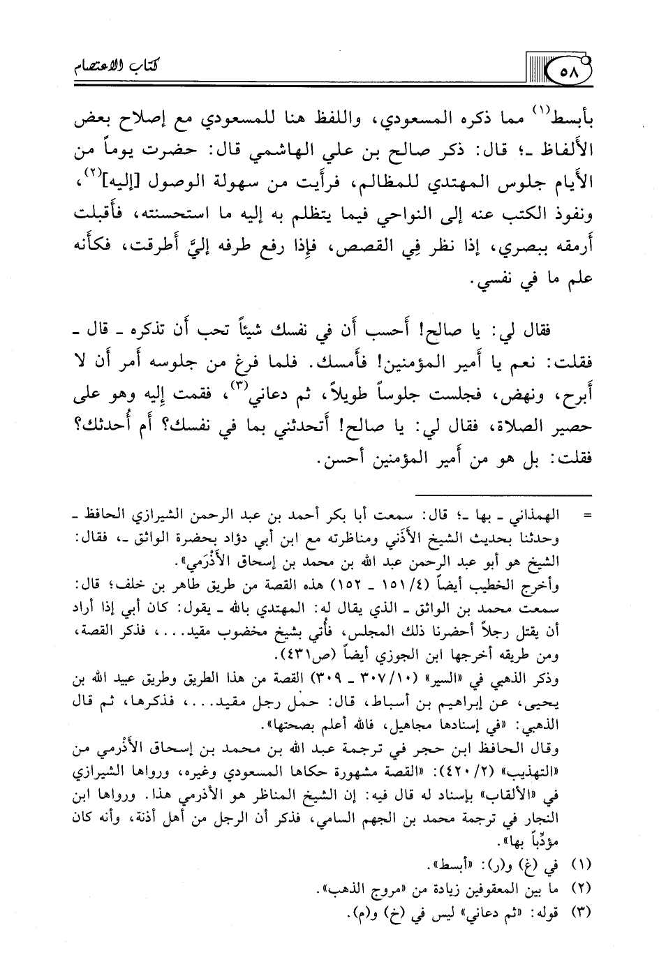 وأخرج الخطيب أيضاً (4/ 151 ـ 152) هذه القصة من طريق طاهر بن خلف؛ قال: سمعت محمد بن الواثق ـ الذي يقال له: المهتدي بالله ـ يقول: كان أبي إذا أراد أن يقتل رجلاً أحضرنا ذلك المجلس، فأُتي بشيخ مخضوب مقيد ... ، فذكر القصة، ومن طريقه أخرجها ابن الجوزي أيضاً (ص431).