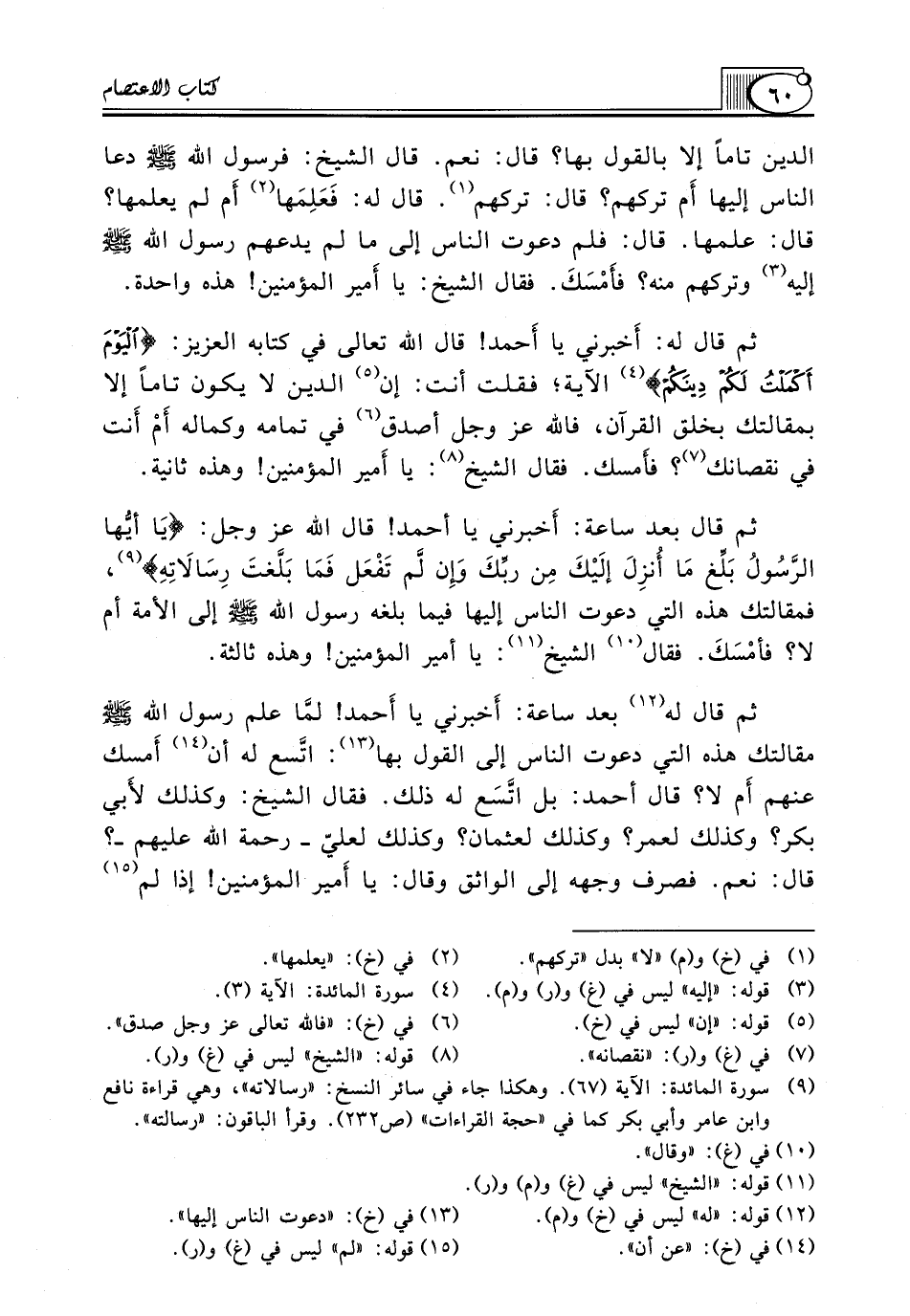 ثُمَّ قَالَ بَعْدَ سَاعَةٍ: أَخبرني يَا أَحْمَدُ! قَالَ اللَّهُ عَزَّ وجل: {يَا أيُّها الرَّسُولُ بَلِّغ مَا أُنزِلَ إلَيْكَ مِن ربِّكَ وَإِن لَّم تَفْعَل فَمَا بَلَّغتَ رِسَالاَتِهِ} (¬9)، فَمَقَالَتُكَ هَذِهِ الَّتِي دَعَوْتَ النَّاسَ إِلَيْهَا فِيمَا بَلَّغَهُ رَسُولُ اللَّهِ صَلَّى اللَّهُ عَلَيْهِ وَسَلَّمَ إِلَى الْأُمَّةِ أَمْ لَا؟ فأمْسَكَ. فَقَالَ (¬10) الشَّيْخُ (¬11): يَا أَمِيرَ الْمُؤْمِنِينَ! وَهَذِهِ ثَالِثَةٌ.