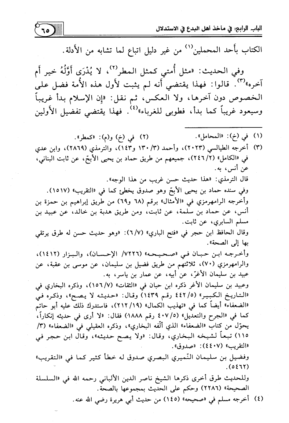 وفي الحديث: "مثل أُمتي كمثل المطر (¬2)، لَا يُدْرَى أَوَّلُهُ خَيْرٌ أَم آخِرُهُ" (¬3). قَالُوا: فَهَذَا يَقْتَضِي أَنه لَمْ يَثْبُتْ لأَول هَذِهِ الأُمة فَضْلٌ عَلَى الْخُصُوصِ دُونَ آخِرِهَا، وَلَا الْعَكْسُ، ثُمَّ نُقِلَ: "إِن الْإِسْلَامَ بَدَأَ غَرِيبًا وَسَيَعُودُ غَرِيبًا كَمَا بَدَأَ، فَطُوبَى لِلْغُرَبَاءِ" (¬4). فَهَذَا يقتضي تفضيل الأَولي