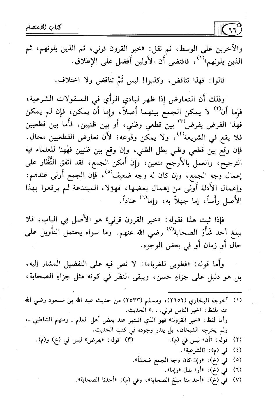 وأما لفظ: "خير القرون" فهو الذي اشتهر عند بعض أهل العلم ـ ومنهم الشاطبي ـ، ولم يخرجه الشيخان، بل يندر وجوده في كتب الحديث.