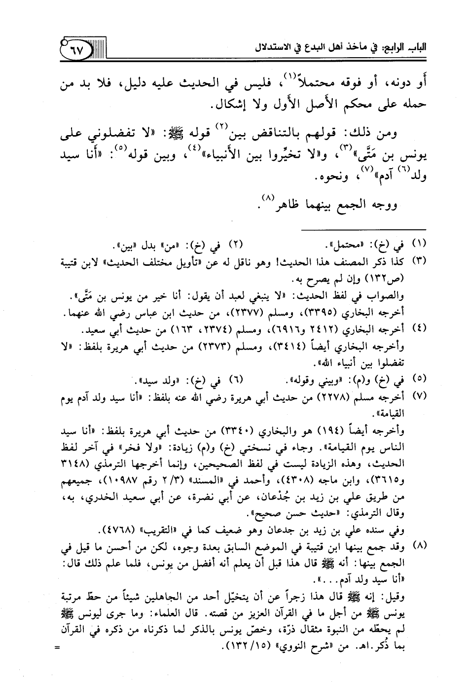 (¬8) وقد جمع بينها ابن قتيبة في الموضع السابق بعدة وجوه، لكن من أحسن ما قيل في الجمع بينها: أنه صلّى الله عليه وسلّم قال هذا قبل أن يعلم أنه أفضل من يونس، فلما علم ذلك قال: "أنا سيد ولد آدم ... ".