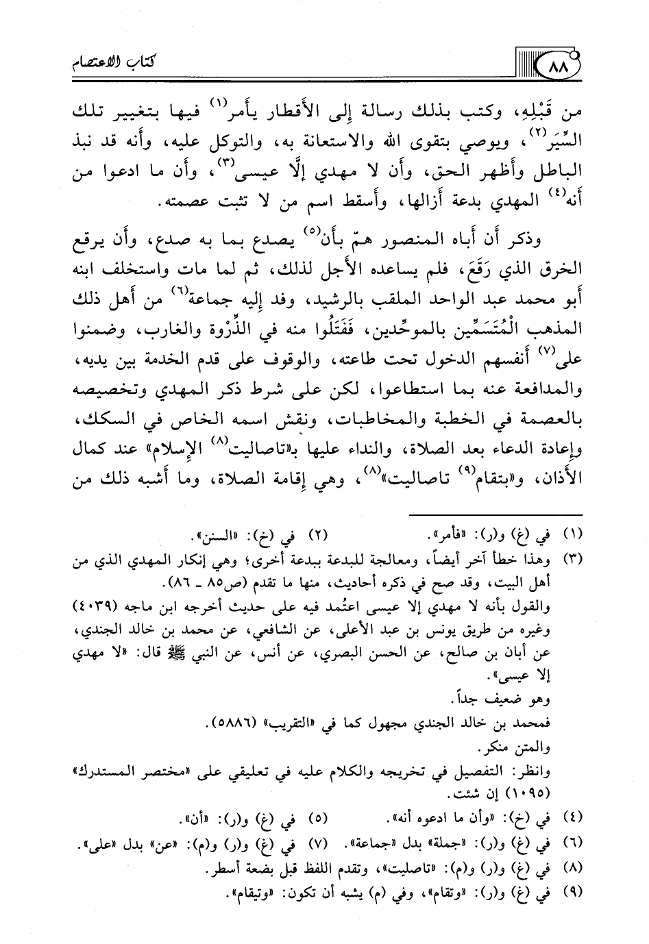 (¬3) وهذا خطأ آخر أيضاً، ومعالجة للبدعة ببدعة أخرى؛ وهي إنكار المهدي الذي من أهل البيت، وقد صح في ذكره أحاديث، منها ما تقدم (ص85 ـ 86).