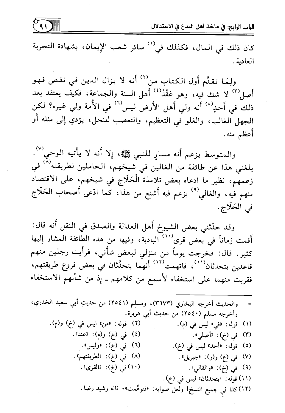 ولِمَا تقدَّم أَول الكتاب من (¬2) أَنه لَا يَزَالُ الدِّينُ فِي نَقْصٍ فَهُوَ أَصل (¬3) لا شك فيه، وهو عَقْدُ (¬4) أَهل السُّنَّةِ وَالْجَمَاعَةِ، فَكَيْفَ يَعْتَقِدُ بَعْدَ ذَلِكَ في أَحدٍ (¬5) أَنه ولي أَهل الأَرض ليس (¬6) فِي الأُمة وَلِيٌّ غَيْرُهُ؟ لَكِنَّ الْجَهْلَ الْغَالِبَ، وَالْغُلُوَّ فِي التَّعْظِيمِ، وَالتَّعَصُّبِ لِلنِّحَلِ، يُؤَدِّي إِلى مِثْلِهِ أَو أَعظم مِنْهُ.