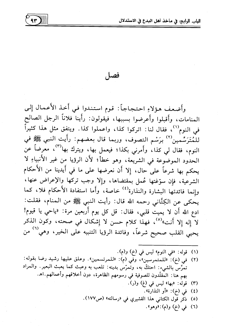 وأَضعف هؤلاءِ احْتِجَاجًا: قَوْمٌ اسْتَنَدُوا فِي أَخذ الأَعمال إِلى الْمَنَامَاتِ، وأَقبلوا وأَعرضوا بِسَبَبِهَا، فيقولون: رأَينا فلاناً الرجل الصالح في النوم (¬1)، فَقَالَ لَنَا: اتْرُكُوا كَذَا، وَاعْمَلُوا كَذَا. وَيَتَّفِقُ مثل هذا كثيراً للمُتَرَسِّمين (¬2) برَسْم التَّصَوُّفِ، وَرُبَّمَا قَالَ بَعْضُهُمْ: رأَيت النَّبِيَّ صَلَّى اللَّهُ عَلَيْهِ وَسَلَّمَ فِي النَّوْمِ، فَقَالَ لِي كَذَا، وأَمرني بِكَذَا؛ فَيَعْمَلُ بِهَا، وَيَتْرُكُ بِهَا (¬3)، مُعْرِضًا عَنِ الْحُدُودِ الْمَوْضُوعَةِ فِي الشَّرِيعَةِ، وَهُوَ خَطَأٌ؛ لأَن الرُّؤْيَا مِنْ غَيْرِ الأَنبياءِ لَا يُحْكَمُ بِهَا شَرْعًا عَلَى حَالٍ، إِلا أَن نعرضها عَلَى مَا فِي أَيدينا مِنَ الأَحكام الشَّرْعِيَّةِ، فإِن سَوَّغَتْهَا عُمل بِمُقْتَضَاهَا، وإِلا وَجَبَ تَرْكُهَا والإعراض عنها، وإِنما فائدتها البشارة والنذارة (¬4) خَاصَّةً، وأَما اسْتِفَادَةُ الأَحكام فَلَا، كَمَا يُحْكَى عَنِ الكِتَّاني رَحِمَهُ اللَّهُ قَالَ: رَأَيْتُ النَّبِيَّ صلّى الله عليه وسلّم من الْمَنَامِ، فَقُلْتُ: ادْعُ اللَّهَ أَن لَا يُمِيتَ قَلْبِي، فَقَالَ: قُلْ كُلَّ يَوْمٍ أَربعين مَرَّةً: "ياحي يَا قَيُّومُ! لَا إِله إِلا أَنت" (¬5)، فَهَذَا كَلَامٌ حَسَنٌ لَا إِشكال فِي صِحَّتِهِ، وَكَوْنُ الذِّكْرِ يُحْيِي الْقَلْبَ صَحِيحٌ شَرْعًا، وَفَائِدَةُ الرُّؤْيَا التنبيه على الخير، وهي (¬6) من