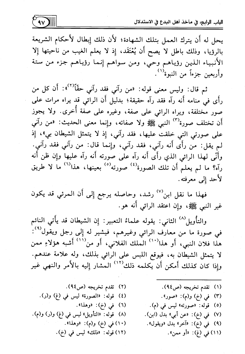 ثُمَّ قَالَ: وَلَيْسَ مَعْنَى قَوْلِهِ: "مَنْ رَآنِي فَقَدْ رَآنِي حَقًّا (¬2) ": أَن كُلَّ مَنْ رأَى فِي مَنَامِهِ أَنه رَآهُ فَقَدْ رَآهُ حَقِيقَةً؛ بِدَلِيلٍ أَن الرَّائِيَ قَدْ يَرَاهُ مَرَّاتٍ عَلَى صُوَرٍ مُخْتَلِفَةٍ، وَيَرَاهُ الرَّائِي عَلَى صِفَةٍ، وَغَيْرِهِ عَلَى صفة أُخرى. ولا يجوز أَن تختلف صورة (¬3) النَّبِيِّ صَلَّى اللَّهُ عَلَيْهِ وَسَلَّمَ وَلَا صِفَاتُهُ، وإِنما مَعْنَى الْحَدِيثِ: "مَنْ رَآنِي عَلَى صُورَتَيِ الَّتِي خُلِقْتُ عَلَيْهَا، فَقَدْ رَآنِي، إِذ لَا يَتَمَثَّلُ الشَّيْطَانُ بِي"، إِذ لَمْ يَقُلْ: مَنْ رأَى أَنه رَآنِي، فَقَدْ رَآنِي، وإِنما قَالَ: مَنْ رَآنِي فَقَدْ رَآنِي. وأَنّى لِهَذَا الرَّائِي الذي رأَى أَنه رآه على صورته أَنه رَآهُ عَلَيْهَا وإِن ظَنَّ أَنه رَآهُ؟ مَا لَمْ يَعْلَمْ أَن تِلْكَ الصُّورَةَ (¬4) صُورَتُهُ (¬5) بعينها، هذا (¬6) مَا لَا طَرِيقَ لأَحد إِلى مَعْرِفَتِهِ.