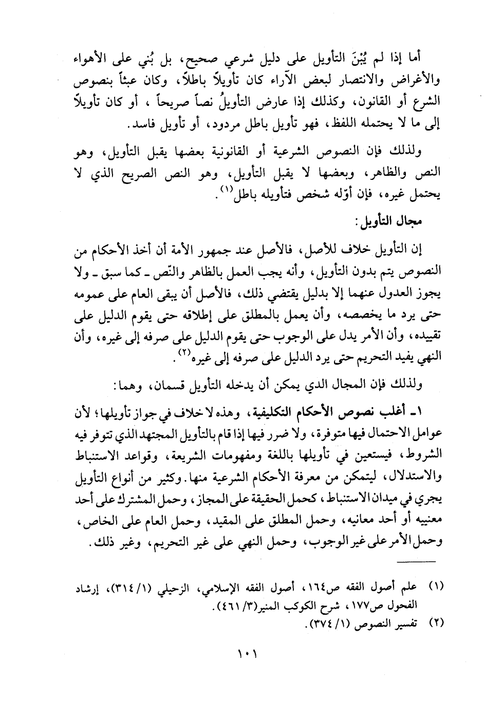 ولذلك فإن النصوص الشرعية أو القانونية بعضها يقبل التأويل، وهو النص والظاهر، وبعضها لا يقبل التأويل، وهو النص الصريح الذي لا يحتمل غيره، فإن أوّله شخص فتأويله باطل (١).