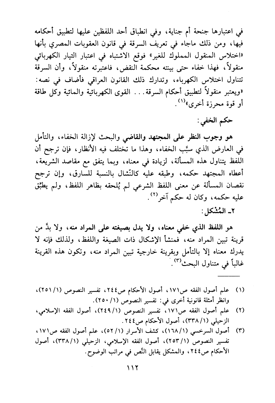 في اعتبارها جنحة أم جناية، وفي انطباق أحد اللفظين عليها لتطبيق أحكامه فيها، ومن ذلك ما جاء في تعريف السرقة في قانون العقوبات المصري بأنها "اختلاس المنقول المملوك للغير" فوقع الاشتباه في اعتبار التيار الكهربائي منقولًا، فهذا خفاء حتى بينته محكمة النقض، فاعتبرته منقولًا، وأن السرقة تتناول اختلاس الكهرباء، وتدارك ذلك القانون العراقي فأضاف في نصه: "ويعتبر منقولًا لتطبيق أحكام السرقة ... القوى الكهربائية والمائية وكل طاقة أو قوة محرزة أخرى" (١).