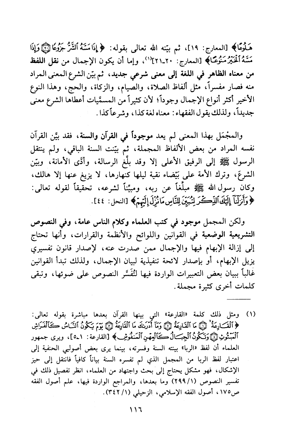 (١) ومثل ذلك كلمة "القارعة" التي بينها القرآن بعدها مباشرة بقوله تعالى: {الْقَارِعَةُ (١) مَا الْقَارِعَةُ (٢) وَمَا أَدْرَاكَ مَا الْقَارِعَةُ (٣) يَوْمَ يَكُونُ النَّاسُ كَالْفَرَاشِ الْمَبْثُوثِ (٤) وَتَكُونُ الْجِبَالُ كَالْعِهْنِ الْمَنْفُوشِ} [القارعة: ١ - ٥]، ويرى جمهور العلماء أن لفظ "الربا" بينته السنة وفسرته، بينما يرى بعض أصوليي الحنفية إلى اعتبار لفظ الربا من المجمل الذي لم تفسره السنة بيانًا كافيًا فانتقل إلى حيز الإشكال، فهو مشكل يحتاج إلى بحث واجتهاد من العلماء، انظر تفصيل ذلك في تفسير النصوص (١/ ٢٩٩) وما بعدها، والمراجع الواردة فيها، علم أصول الفقه ص ١٧٥، أصول الفقه الإسلامي، الزحيلي (١/ ٣٤٢).