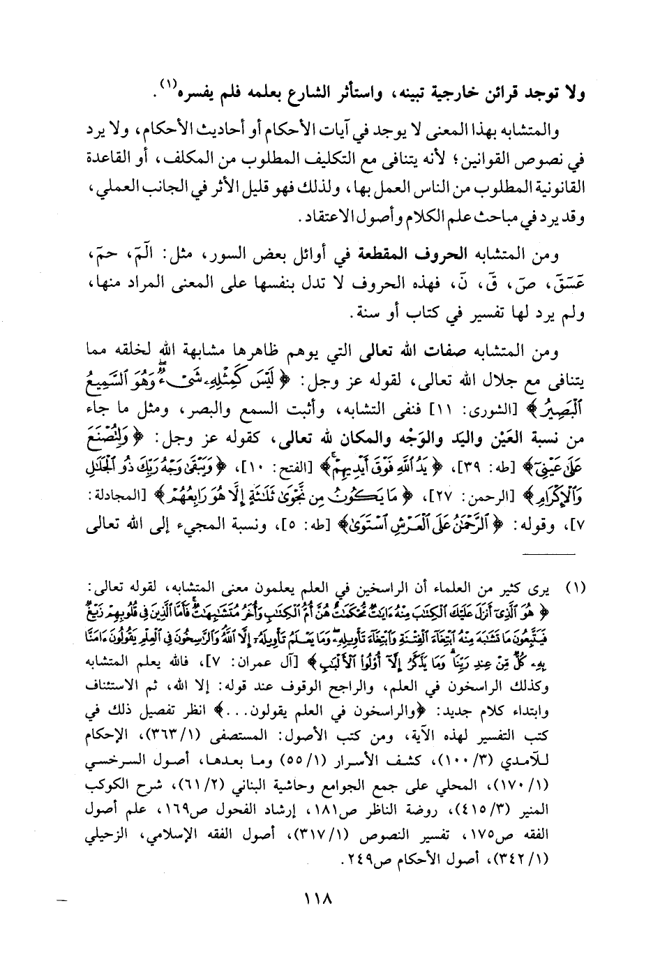 (١) يرى كثير من العلماء أن الراسخين في العلم يعلمون معنى المتشابه، لقوله تعالى: {هُوَ الَّذِي أَنْزَلَ عَلَيْكَ الْكِتَابَ مِنْهُ آيَاتٌ مُحْكَمَاتٌ هُنَّ أُمُّ الْكِتَابِ وَأُخَرُ مُتَشَابِهَاتٌ فَأَمَّا الَّذِينَ فِي قُلُوبِهِمْ زَيْغٌ فَيَتَّبِعُونَ مَا تَشَابَهَ مِنْهُ ابْتِغَاءَ الْفِتْنَةِ وَابْتِغَاءَ تَأْوِيلِهِ وَمَا يَعْلَمُ تَأْوِيلَهُ إلا اللَّهُ وَالرَّاسِخُونَ فِي الْعِلْمِ يَقُولُونَ آمَنَّا بِهِ كُلٌّ مِنْ عِنْدِ رَبِّنَا وَمَا يَذَّكَّرُ إلا أُولُو الْأَلْبَابِـ (٧)} [آل عمران: ٧]، فاللَّه يعلم المتشابه وكذلك الراسخون في العلم، والراجح الوقوف عند قوله: إلا اللَّه، ثم الاستئناف وابتداء كلام جديد: {وَالرَّاسِخُونَ فِي الْعِلْمِ يَقُولُونَ ...} انظر تفصيل ذلك في كتب التفسير لهذه الآية، ومن كتب الأصول: المستصفى (١/ ٣٦٣)، الإحكام للآمدي (٣/ ١٠٠)، كشف الأسرار (١/ ٥٥) وما بعدها، أصول السرخسي (١/ ١٧٠)، المحلي على جمع الجوامع وحاشية البناني (٢/ ٦١)، شرح الكوكب المنير (٣/ ٤١٥)، روضة الناظر ص ١٨١، إرشاد الفحول ص ١٦٩، علم أصول الفقه ص ١٧٥، تفسير النصوص (١/ ٣١٧)، أصول الفقه الإسلامي، الزحيلي (١/ ٣٤٢)، أصول الأحكام ص ٢٤٩.