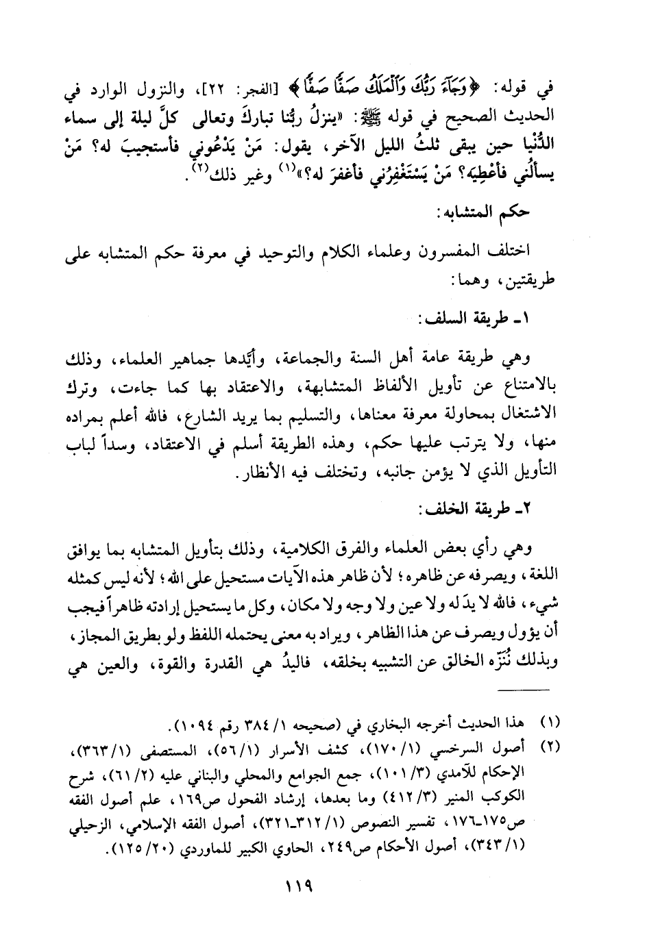 في قوله: {وَجَاءَ رَبُّكَ وَالْمَلَكُ صَفًّا صَفًّا (٢٢)} [الفجر: ٢٢]، والنزول الوارد في الحديث الصحيح في قوله - صلى الله عليه وسلم -: "ينزلُ ربُّنا تباركَ وتعالى كلَّ ليلة إلى سماء الدُّنْيا حين يبقى ثلثُ الليل الآخر، يقول: مَنْ يَدْعُوني فأستجيبَ له؟ مَنْ يسألُني فأعْطِيَه؟ مَنْ يَسْتَغْفِرُني فأغفرَ له؟ " (١) وغير ذلك (٢).
