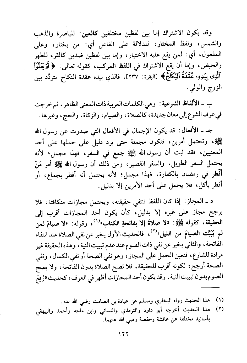د- المجاز: إذا كان اللفظ تنتفي حقيقته، ويحتمل مجازات متكافئة، فلا يرجح مجاز على غيره إلا بدليل، كأن يكون أحد المجازات أقرب إلى الحقيقة، كقوله - صلى الله عليه وسلم -: "لا صلاةَ إلا بفاتحةِ الكتاب" (١)، وقوله: "لا صيامَ لمن لم يُبَيِّت الصيامَ من الليل" (٢)، فالحديث الأول يخبر عن نفي الصلاة عند انتفاء الفاتحة، والثاني يخبر عن نفي ذات الصوم عند عدم تبييت النية، وهذه الحقيقة غير مرادة للشارع، فتعين الحمل على المجاز، وهو نفي الصحة أو نفي الكمال، ونفي الصحة أرجح؛ لكونه أقرب للحقيقة، فلا تصح الصلاة بدون الفاتحة، ولا يصح الصوم بدون تبييت النية. وقد يكون أحد المجازات أظهر في العرف، كحديث "رُفِعَ