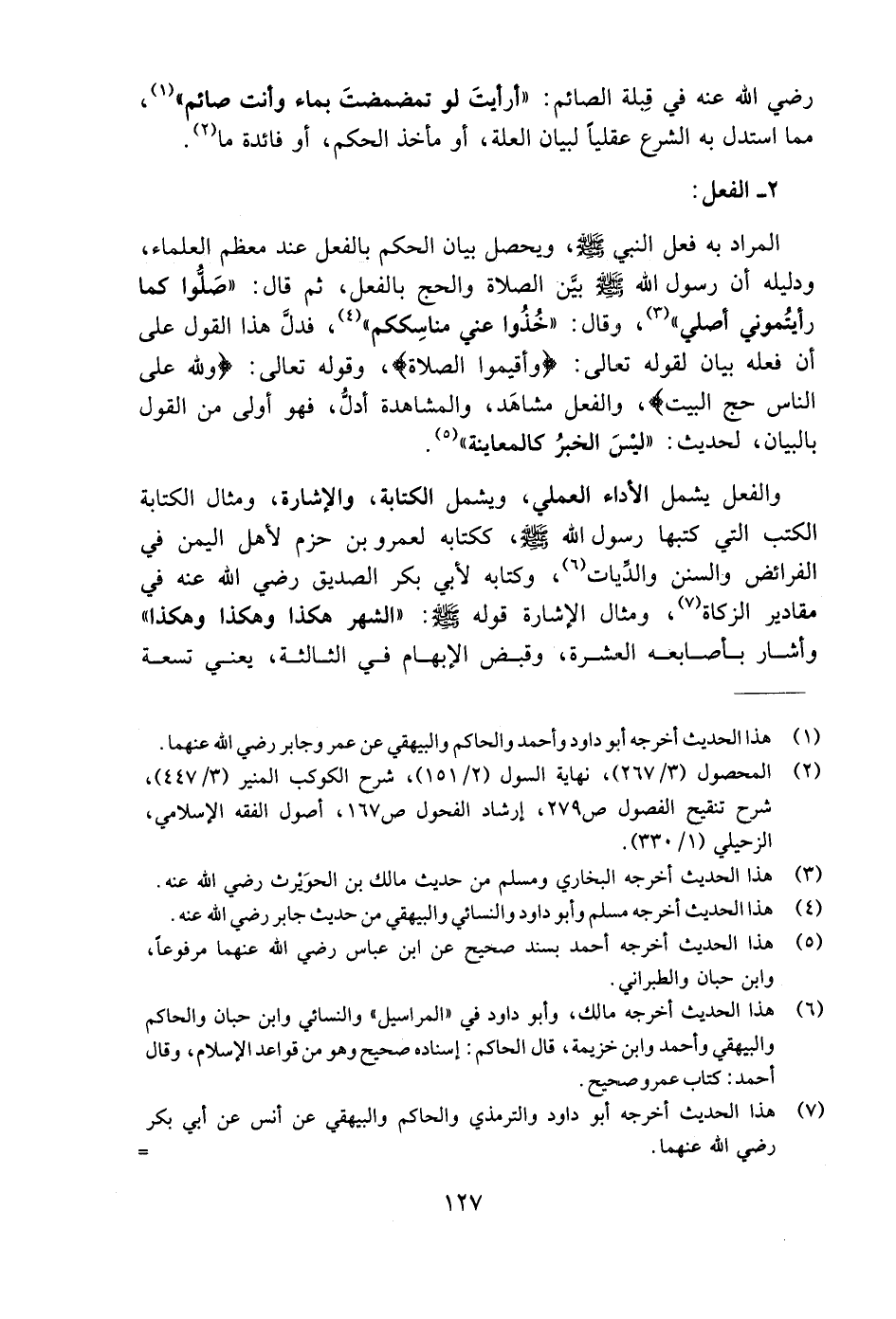 والفعل يشمل الأداء العملي، ويشمل الكتابة، والإشارة، ومثال الكتابة الكتب التي كتبها رسول اللَّه - صلى الله عليه وسلم -، ككتابه لعمرو بن حزم لأهل اليمن في الفرائض والسنن والدِّيات (٦)، وكتابه لأبي بكر الصديق رضي اللَّه عنه في مقادير الزكاة (٧)، ومثال الإشارة قوله - صلى الله عليه وسلم -: "الشهر هكذا وهكذا وهكذا" وأشار بأصابعه العشرة، وقبض الإبهام في الثالثة، يعني تسعة