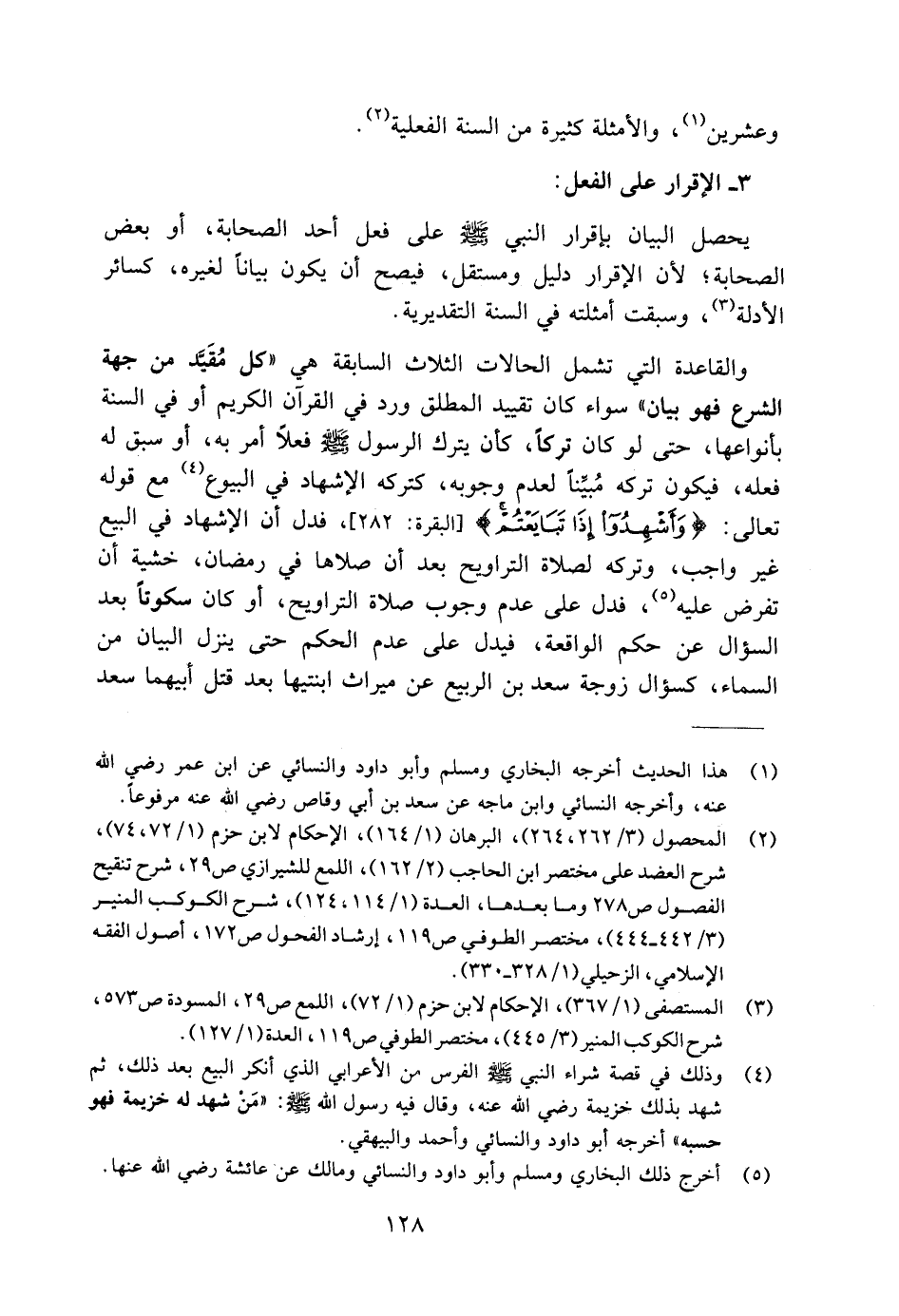 يحصل البيان بإقرار النبي - صلى الله عليه وسلم - على فعل أحد الصحابة، أو بعض الصحابة؛ لأن الإقرار دليل ومستقل، فيصح أن يكون بيانًا لغيره، كسائر الأدلة (٣)، وسبقت أمثلته في السنة التقديرية.