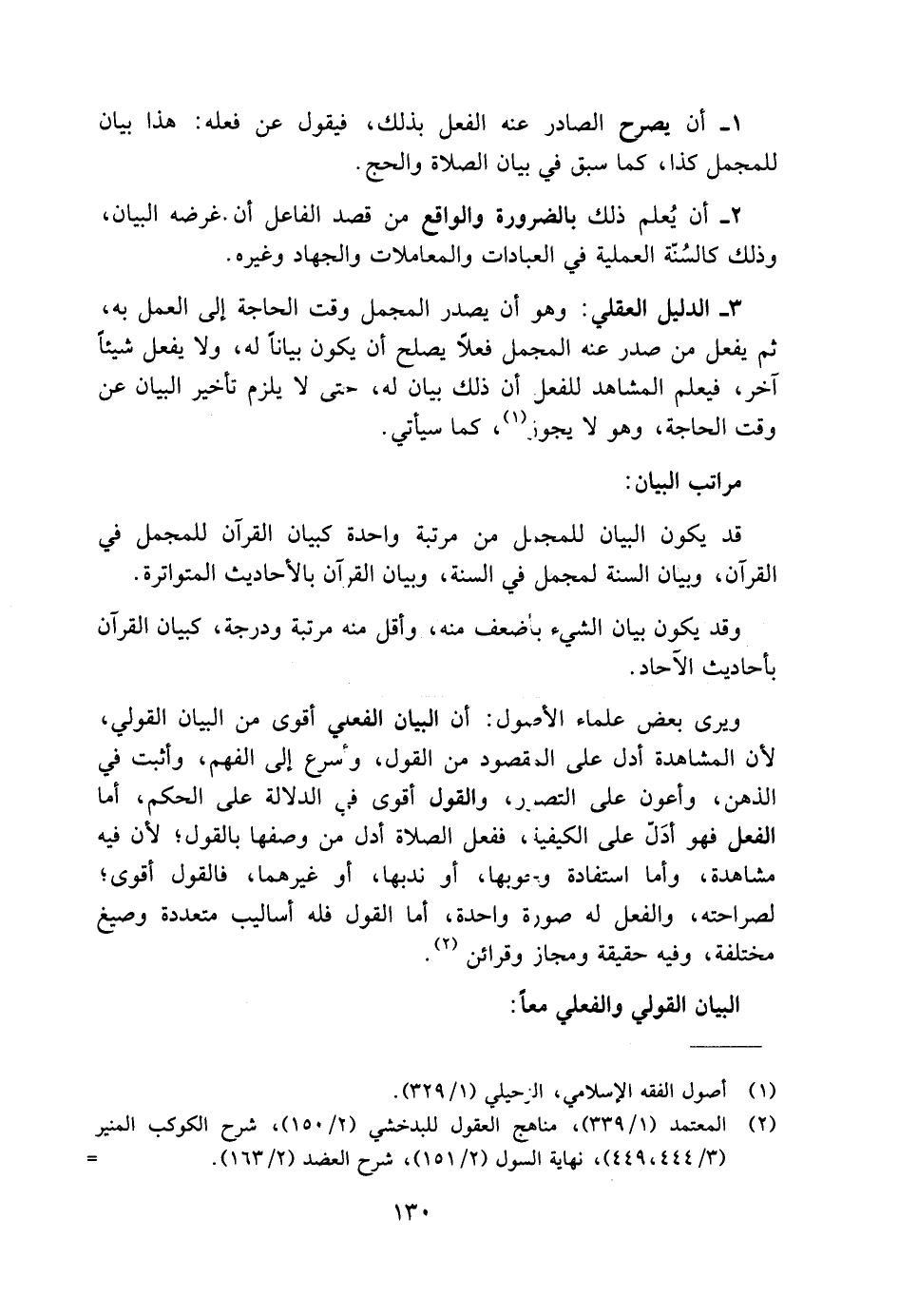 ويرى بعض علماء الأصول: أن البيان الفعلي أقوى من البيان القولي، لأن المشاهدة أدل على المقصود من القول، وأسرع إلى الفهم، وأثبت في الذهن، وأعون على التصور، والقول أقوى في الدلالة على الحكم، أما الفعل فهو أدَلّ على الكيفية، ففعل الصلاة أدل من وصفها بالقول؛ لأن فيه مشاهدة، وأما استفادة وجوبها، أو ندبها، أو غيرهما، فالقول أقوى؛ لصراحته، والفعل له صورة واحدة، أما القول فله أساليب متعددة وصيغ مختلفة، وفيه حقيقة ومجاز وقرائن (٢).