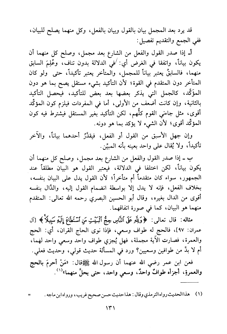 قد يرد بعد المجمل بيان بالقول وبيان بالفعل، وكل منهما يصلح للبيان، ففي الجمع والتقديم تفصيل: