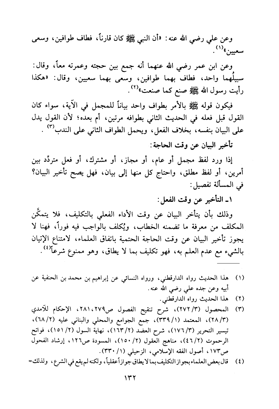 فيكون قوله - صلى الله عليه وسلم - بالأمر بطواف واحد بيانًا للمجمل في الآية، سواء كان القول قبل فعله في الحديث الثاني بطوافه مرتين، أم بعده؛ لأن القول يدل على البيان بنفسه، بخلاف الفعل، ويحمل الطواف الثاني على الندب (٣).