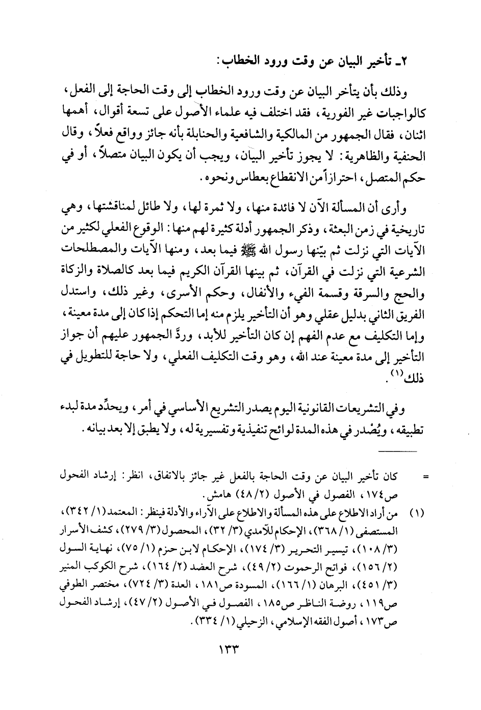 وأرى أن المسألة الآن لا فائدة منها، ولا ثمرة لها، ولا طائل لمناقشتها، وهي تاريخية في زمن البعثة، وذكر الجمهور أدلة كثيرة لهم منها: الوقوع الفعلي لكثير من الآيات التي نزلت ثم بيّنها رسول اللَّه - صلى الله عليه وسلم - فيما بعد، ومنها الآيات والمصطلحات الشرعية التي نزلت في القرآن، ثم بينها القرآن الكريم فيما بعد كالصلاة والزكاة والحج والسرقة وقسمة الفيء والأنفال، وحكم الأسرى، وغير ذلك، واستدل الفريق الثاني بدليل عقلي وهو أن التأخير يلزم منه إما التحكم إذا كان إلى مدة معينة، وإما التكليف مع عدم الفهم إن كان التأخير للأبد، وردَّ الجمهور عليهم أن جواز التأخير إلى مدة معينة عند اللَّه، وهو وقت التكليف الفعلي، ولا حاجة للتطويل في ذلك (١).