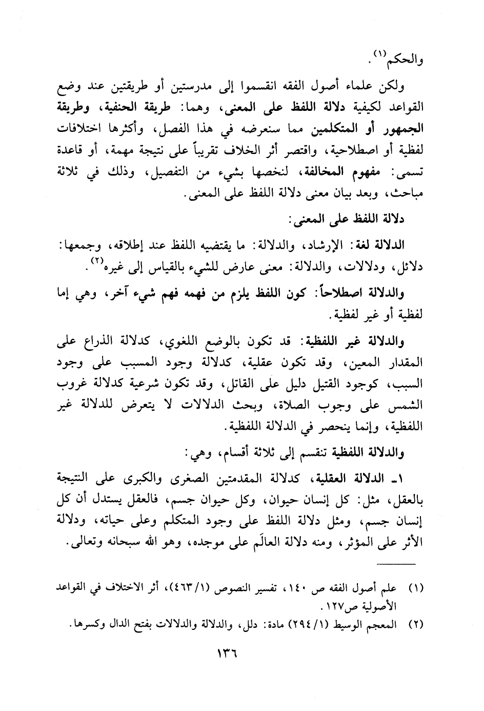 ولكن علماء أصول الفقه انقسموا إلى مدرستين أو طريقتين عند وضع القواعد لكيفية دلالة اللفظ على المعنى، وهما: طريقة الحنفية، وطريقة الجمهور أو المتكلمين مما سنعرضه في هذا الفصل، وأكثرها اختلافات لفظية أو اصطلاحية، واقتصر أثر الخلاف تقريبًا على نتيجة مهمة، أو قاعدة تسمى: مفهوم المخالفة، لنخصها بشيء من التفصيل، وذلك في ثلاثة مباحث، وبعد بيان معنى دلالة اللفظ على المعنى.