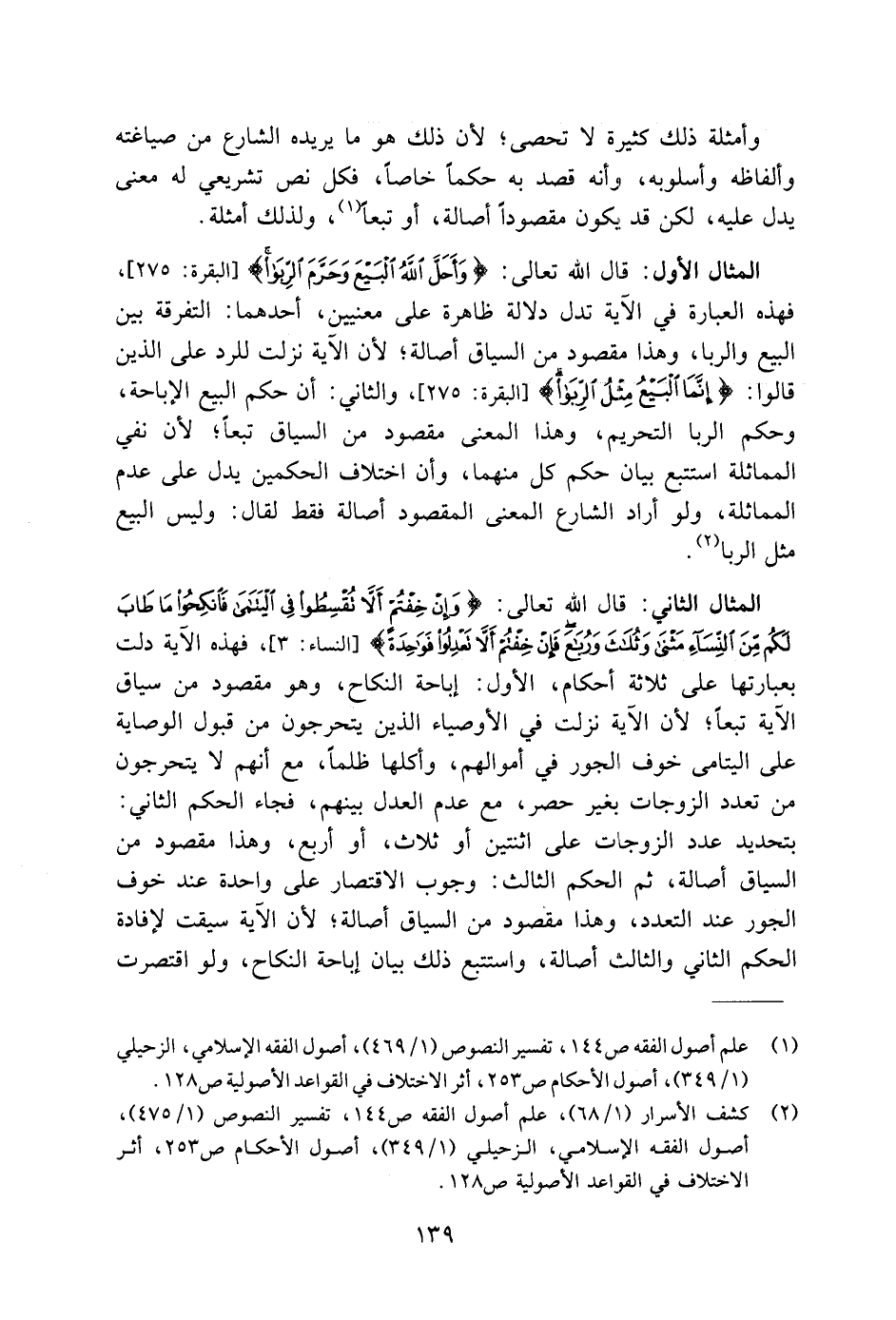المثال الأول: قال اللَّه تعالى: {وَأَحَلَّ اللَّهُ الْبَيْعَ وَحَرَّمَ الرِّبَا} [البقرة: ٢٧٥]، فهذه العبارة في الآية تدل دلالة ظاهرة على معنيين، أحدهما: التفرقة بين البيع والربا، وهذا مقصود من السياق أصالة؛ لأن الآية نزلت للرد على الذين قالوا: {إِنَّمَا الْبَيْعُ مِثْلُ الرِّبَا} [البقرة: ٢٧٥]، والثاني: أن حكم البيع الإباحة، وحكم الربا التحريم، وهذا المعنى مقصود من السياق تبعًا؛ لأن نفي المماثلة استتبع بيان حكم كل منهما، وأن اختلاف الحكمين يدل على عدم المماثلة، ولو أراد الشارع المعنى المقصود أصالة فقط لقال: وليس البيع مثل الربا (٢).