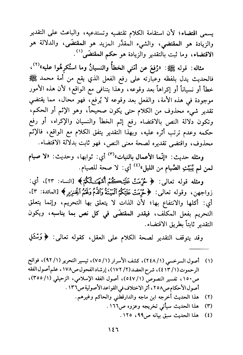 ومثله قوله تعالى: {حُرِّمَتْ عَلَيْكُمْ أُمَّهَاتُكُمْ} [النساء: ٢٣]، أي: زواجهن، وقوله تعالى: {حُرِّمَتْ عَلَيْكُمُ الْمَيْتَةُ وَالدَّمُ وَلَحْمُ الْخِنْزِيرِ} [المائدة: ٣]، أي: أكلها والانتفاع بها؛ لأن الذات لا يتعلق بها التحريم، وإنما يتعلق التحريم بفعل المكلف، فيقدر المقتضَى في كل نص بما يناسبه، ويكون التقدير ثابتًا بطريق الاقتضاء.