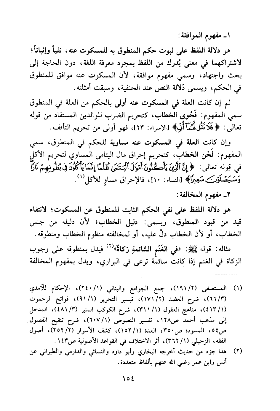 مثاله: قوله - صلى الله عليه وسلم -: "في الغَنَمِ السَّائِمةِ زكاةٌ" (٢) فيدل بمنطوقه على وجوب الزكاة في الغنم إذا كانت سائمة ترعى في البراري، ويدل بمفهوم المخالفة