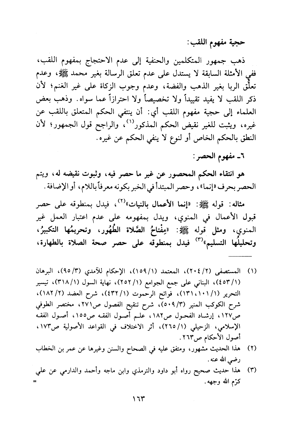 مثاله: قوله - صلى الله عليه وسلم -: "إنما الأعمال بالنيات" (٢)، فيدل بمنطوقه على حصر قبول الأعمال في المنوي، ويدل بمفهومه على عدم اعتبار العمل غير المنوي، ومثل قوله - صلى الله عليه وسلم -: "مِفْتاحُ الصَّلاة الطُهُور، وتحريمُها التكبيرُ، وتحليلُها التسليم" (٣) فيدل بمنطوقه على حصر صحة الصلاة بالطهارة،