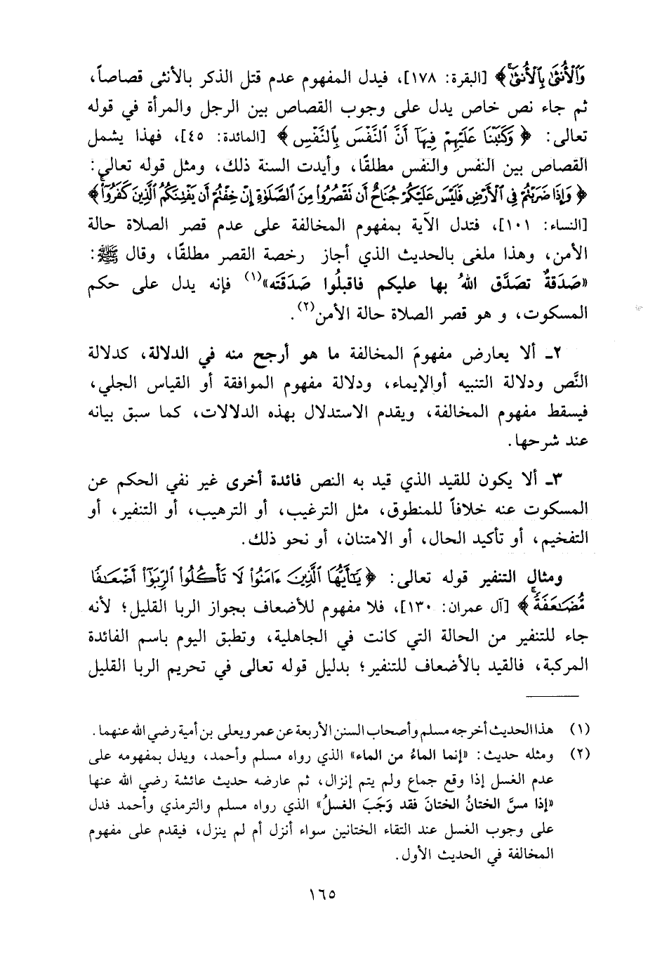 وَالْأُنْثَى بِالْأُنْثَى} [البقرة: ١٧٨]، فيدل المفهوم عدم قتل الذكر بالأنثى قصاصًا، ثم جاء نص خاص يدل على وجوب القصاص بين الرجل والمرأة في قوله تعالى: {وَكَتَبْنَا عَلَيْهِمْ فِيهَا أَنَّ النَّفْسَ بِالنَّفْسِ} [المائدة: ٤٥]، فهذا يشمل القصاص بين النفس والنفس مطلقًا، وأيدت السنة ذلك، ومثل قوله تعالى: {وَإِذَا ضَرَبْتُمْ فِي الْأَرْضِ فَلَيْسَ عَلَيْكُمْ جُنَاحٌ أَنْ تَقْصُرُوا مِنَ الصَّلَاةِ إِنْ خِفْتُمْ أَنْ يَفْتِنَكُمُ الَّذِينَ كَفَرُوا} [النساء: ١٠١]، فتدل الآية بمفهوم المخالفة على عدم قصر الصلاة حالة الأمن، وهذا ملغى بالحديث الذي أجاز رخصة القصر مطلقًا، وقال - صلى الله عليه وسلم -: "صَدَقةٌ تصَدَّق اللَّهُ بها عليكم فاقبلُوا صَدَقتَه" (١) فإنه يدل على حكم المسكوت، وهو قصر الصلاة حالة الأمن (٢).