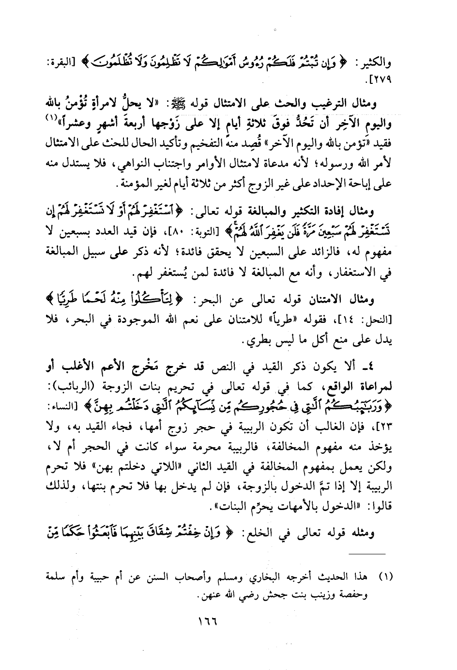 ٤ - ألا يكون ذكر القيد في النص قد خرج مَخْرج الأعم الأغلب أو لمراعاة الواقع، كما في قوله تعالى في تحريم بنات الزوجة (الربائب): {وَرَبَائِبُكُمُ اللَّاتِي فِي حُجُورِكُمْ مِنْ نِسَائِكُمُ اللَّاتِي دَخَلْتُمْ بِهِنَّ فَإِنْ لَمْ تَكُونُوا دَخَلْتُمْ بِهِنَّ} [النساء: ٢٣]، فإن الغالب أن تكون الربيبة في حجر زوج أمها، فجاء القيد به، ولا يؤخذ منه مفهوم المخالفة، فالربيبة محرمة سواء كانت في الحجر أم لا، ولكن يعمل بمفهوم المخالفة في القيد الثاني "اللاتي دخلتم بهن" فلا تحرم الربيبة إلا إذا تمَّ الدخول بالزوجة، فإن لم يدخل بها فلا تحرم بنتها، ولذلك قالوا: "الدخول بالأمهات يحرِّم البنات".