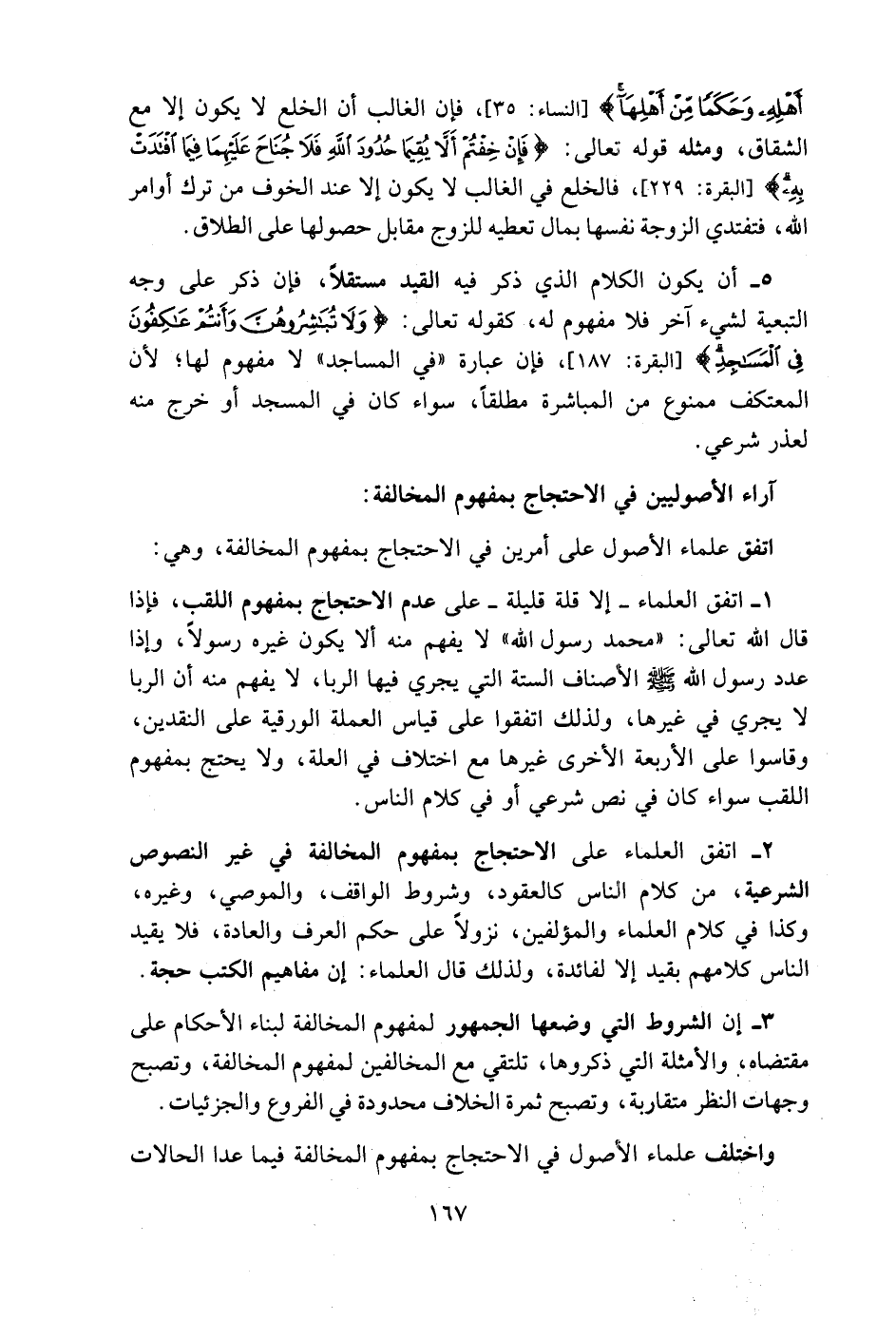 ٣ - إن الشروط التي وضعها الجمهور لمفهوم المخالفة لبناء الأحكام على مقتضاه، والأمثلة التي ذكروها، تلتقي مع المخالفين لمفهوم المخالفة، وتصبح وجهات النظر متقاربة، وتصبح ثمرة الخلاف محدودة في الفروع والجزئيات.
