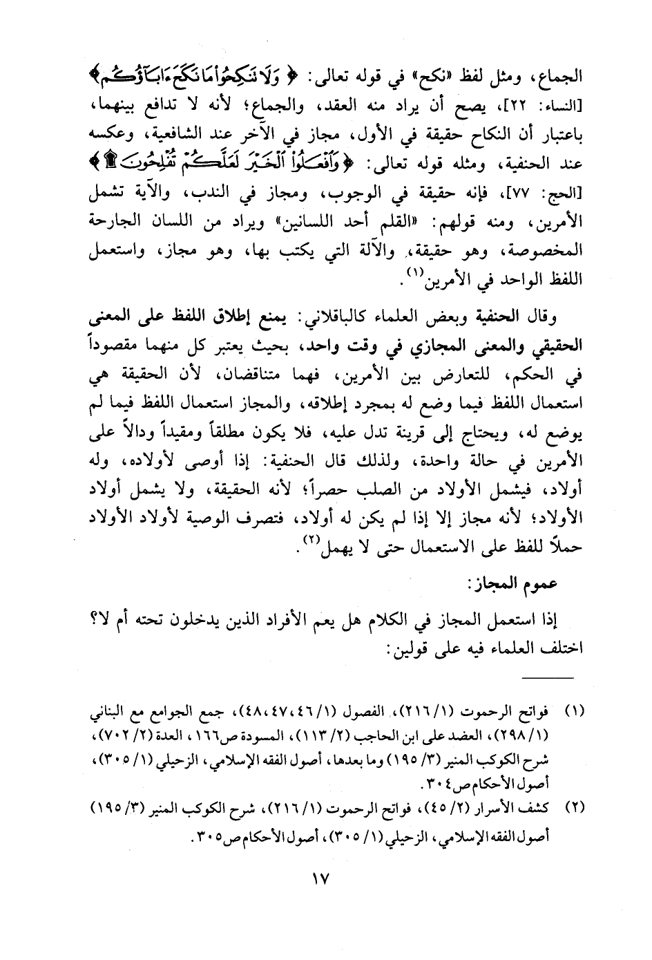 الجماع، ومثل لفظ "نكح" في قوله تعالى: {وَلَا تَنْكِحُوا مَا نَكَحَ آبَاؤُكُمْ} [النساء: ٢٢]، يصح أن يراد منه العقد، والجماع؛ لأنه لا تدافع بينهما، باعتبار أن النكاح حقيقة في الأول، مجاز في الآخر عند الشافعية، وعكسه عند الحنفية، ومثله قوله تعالى: {وَافْعَلُوا الْخَيْرَ لَعَلَّكُمْ تُفْلِحُونَ (٧٧)} [الحج: ٧٧]، فإنه حقيقة في الوجوب، ومجاز في الندب، والآية تشمل الأمرين، ومنه قولهم: "القلم أحد اللسانين" ويراد من اللسان الجارحة المخصوصة، وهو حقيقة، والآلة التي يكتب بها، وهو مجاز، واستعمل اللفظ الواحد في الأمرين (١).
