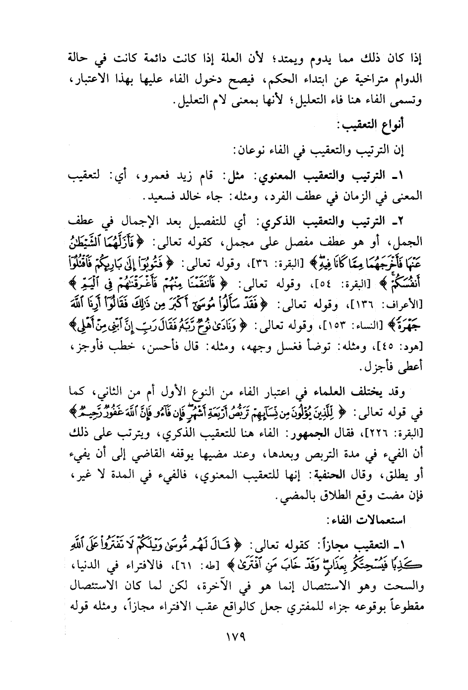 ٢ - الترتيب والتعقيب الذكري: أي للتفصيل بعد الإجمال في عطف الجمل، أو هو عطف، مفصل على مجمل، كقوله تعالى: {فَأَزَلَّهُمَا الشَّيْطَانُ عَنْهَا فَأَخْرَجَهُمَا مِمَّا كَانَا فِيهِ} [البقرة: ٣٦]، وقوله تعالى: {فَتُوبُوا إِلَى بَارِئِكُمْ فَاقْتُلُوا أَنْفُسَكُمْ} [البقرة: ١٤]، وقوله تعالى: {فَانْتَقَمْنَا مِنْهُمْ فَأَغْرَقْنَاهُمْ فِي الْيَمِّ} [الأعراف: ١٣٦]، وقوله تعالى: {فَقَدْ سَأَلُوا مُوسَى أَكْبَرَ مِنْ ذَلِكَ فَقَالُوا أَرِنَا اللَّهَ جَهْرَةً} [النساء: ١٥٣]، وقوله تعالى: {وَنَادَى نُوحٌ رَبَّهُ فَقَالَ رَبِّ إِنَّ ابْنِي مِنْ أَهْلِي} [هود: ٤٥]، ومثله: توضأ فغسل وجهه، ومثله: قال فأحسن، خطب فأوجز، أعطى فأجزل.