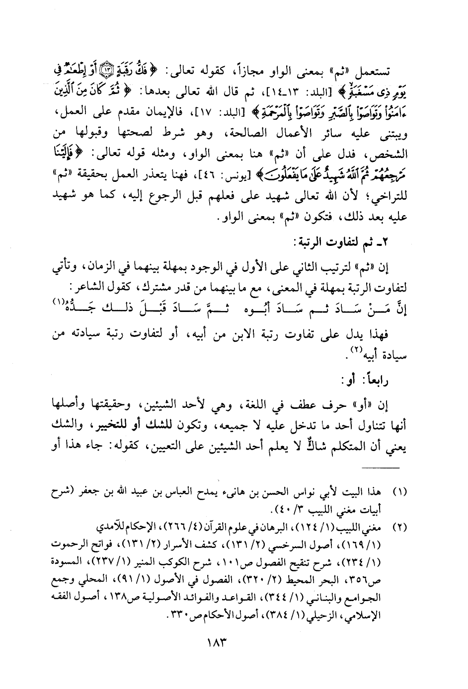 إن "ثم" لترتيب الثاني على الأول في الوجود بمهلة بينهما في الزمان، وتأتي لتفاوت الرتبة بمهلة في المعنى، مع ما بينهما من قدر مشترك، كقول الشاعر: