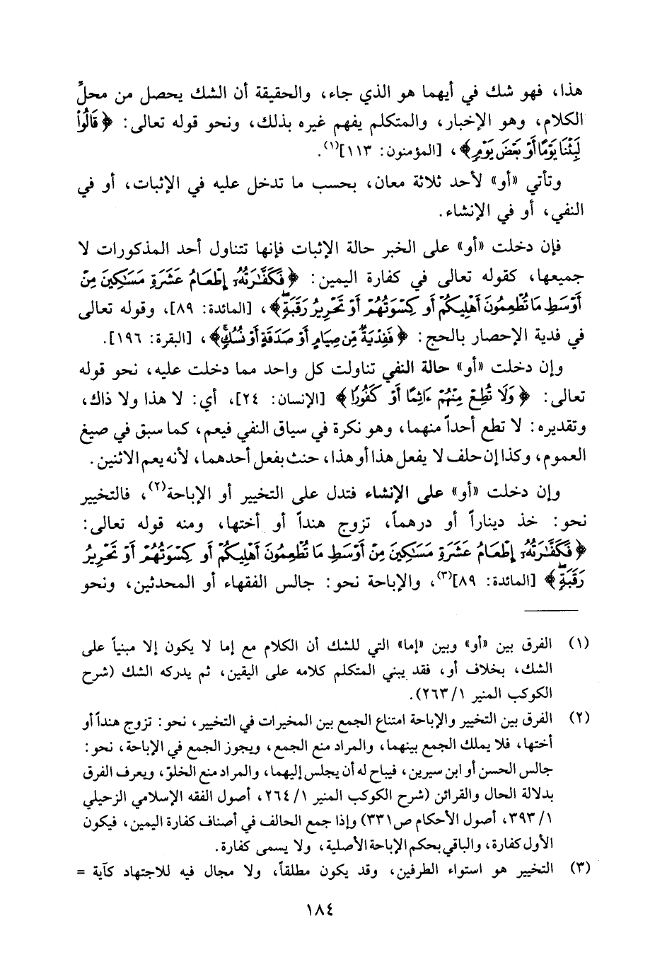 (١) الفرق بين "أو" وبين "إما" الي للشك أن الكلام مع إما لا يكون إلا مبنيًّا على الشك، بخلاف أو، فقد يبني المتكلم كلامه على اليقين، ثم يدركه الشك (شرح الكوكب المنير ١/ ٢٦٣).