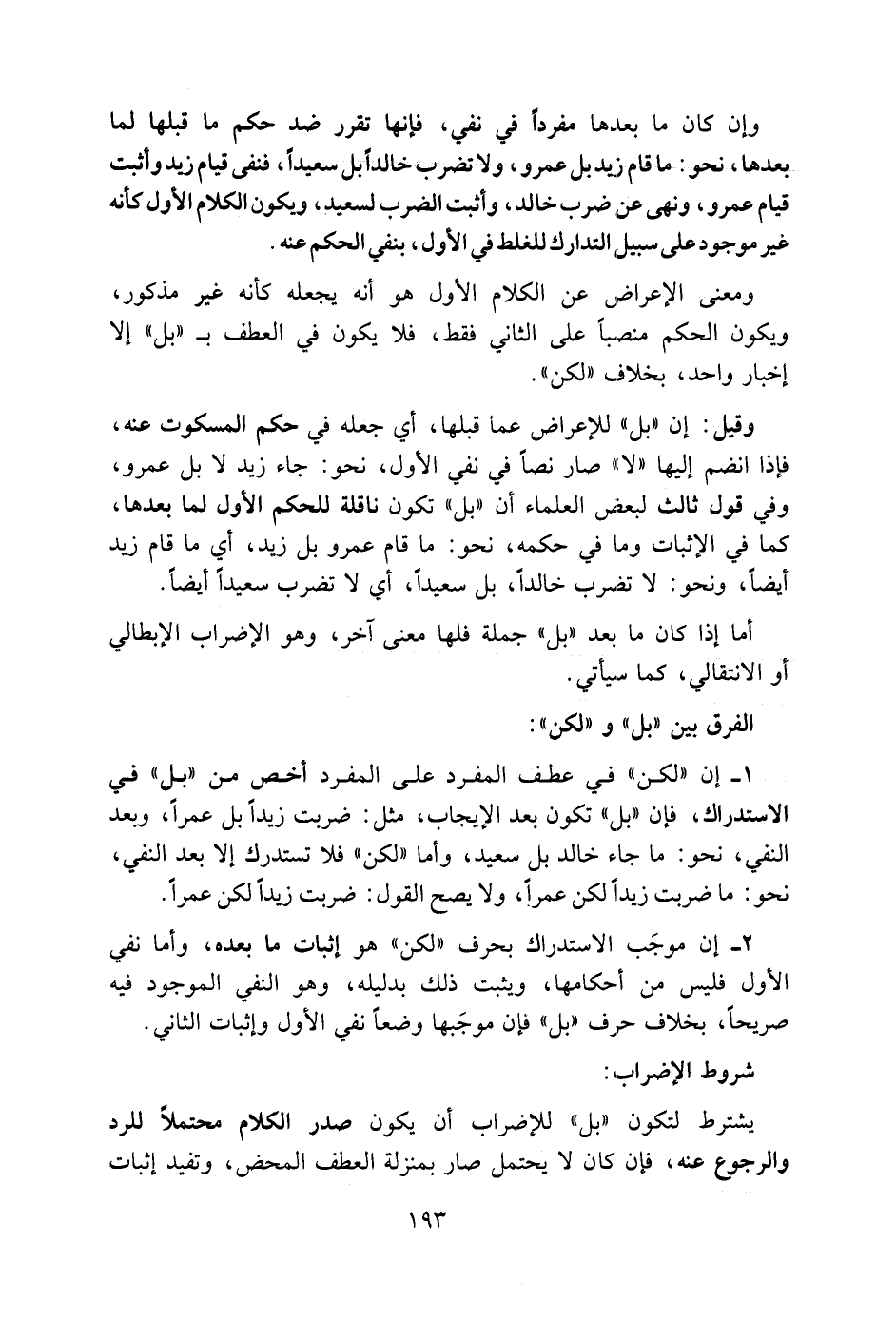 وقيل: إن "بل" للإعراض عما قبلها، أي جعله في حكم المسكوت عنه، فإذا انضم إليها "لا" صار نصًّا في نفي الأول، نحو: جاء زيد لا بل عمرو، وفي قول ثالث لبعض العلماء أن "بل" تكون ناقلة للحكم الأول لما بعدها، كما في الإثبات وما في حكمه، نحو: ما قام عمرو بل زيد، أي ما قام زيد أيضًا، ونحو: لا تضرب خالدًا، بل سعيدًا، أي لا تضرب سعيدًا أيضًا.